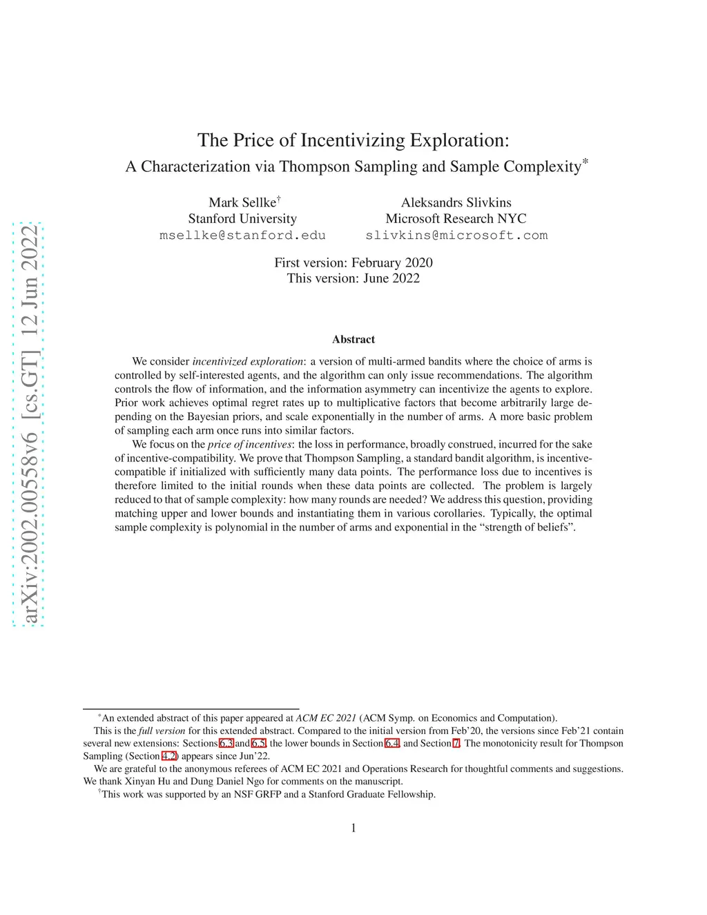The Price of Incentivizing Exploration: A Characterization via Thompson