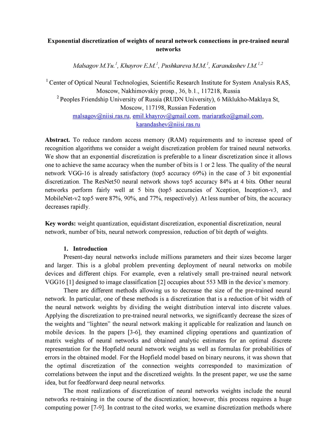To reduce random access memory (RAM) requirements and to increase speed of recognition algorithms we consider a weight discretization problem for trained neural networks. We show that an exponential discretization is preferable to a linear discretization since it allows one to achieve the same accuracy when the number of bits is 1 or 2 less. The quality of the neural network VGG-16 is already satisfactory (top5 accuracy 69%) in the case of 3 bit exponential discretization. The ResNet50 neural network shows top5 accuracy 84% at 4 bits. Other neural networks perform fairly well at 5 bits (top5 accuracies of Xception, Inception-v3, and MobileNet-v2 top5 were 87%, 90%, and 77%, respectively). At less number of bits, the accuracy decreases rapidly.