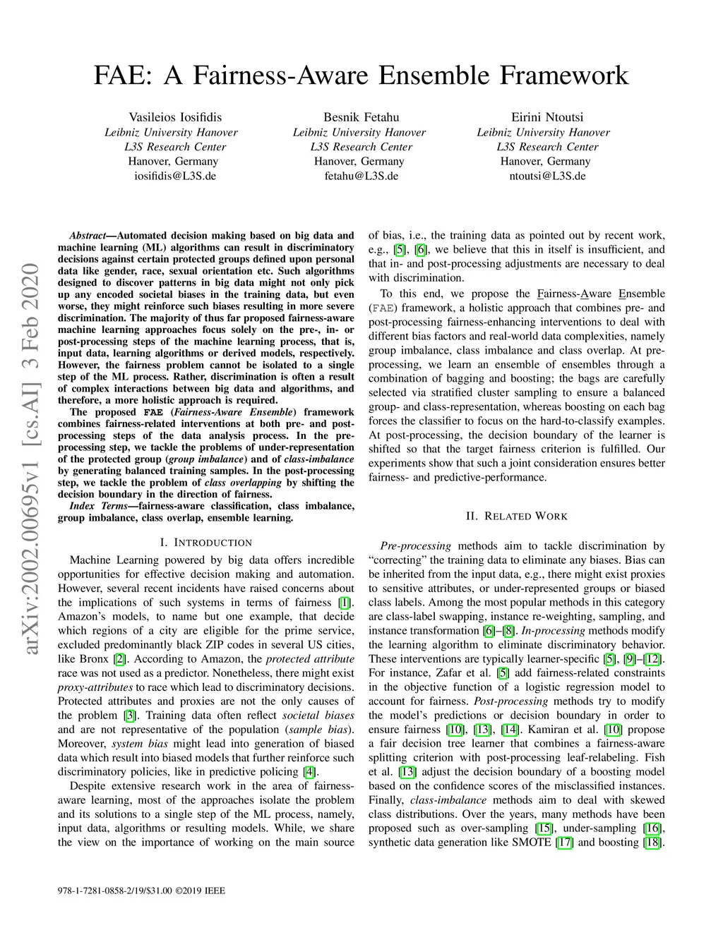 Automated decision making based on big data and machine learning (ML) algorithms can result in discriminatory decisions against certain protected groups defined upon personal data like gender, race, sexual orientation etc. Such algorithms designed to discover patterns in big data might not only pick up any encoded societal biases in the training data, but even worse, they might reinforce such biases resulting in more severe discrimination. The majority of thus far proposed fairness-aware machine learning approaches focus solely on the pre-, in- or post-processing steps of the machine learning process, that is, input data, learning algorithms or derived models, respectively. However, the fairness problem cannot be isolated to a single step of the ML process. Rather, discrimination is often a result of complex interactions between big data and algorithms, and therefore, a more holistic approach is required. The proposed FAE (Fairness-Aware Ensemble) framework combines fairness-related interventions at both pre- and postprocessing steps of the data analysis process. In the preprocessing step, we tackle the problems of under-representation of the protected group (group imbalance) and of class-imbalance by generating balanced training samples. In the post-processing step, we tackle the problem of class overlapping by shifting the decision boundary in the direction of fairness.