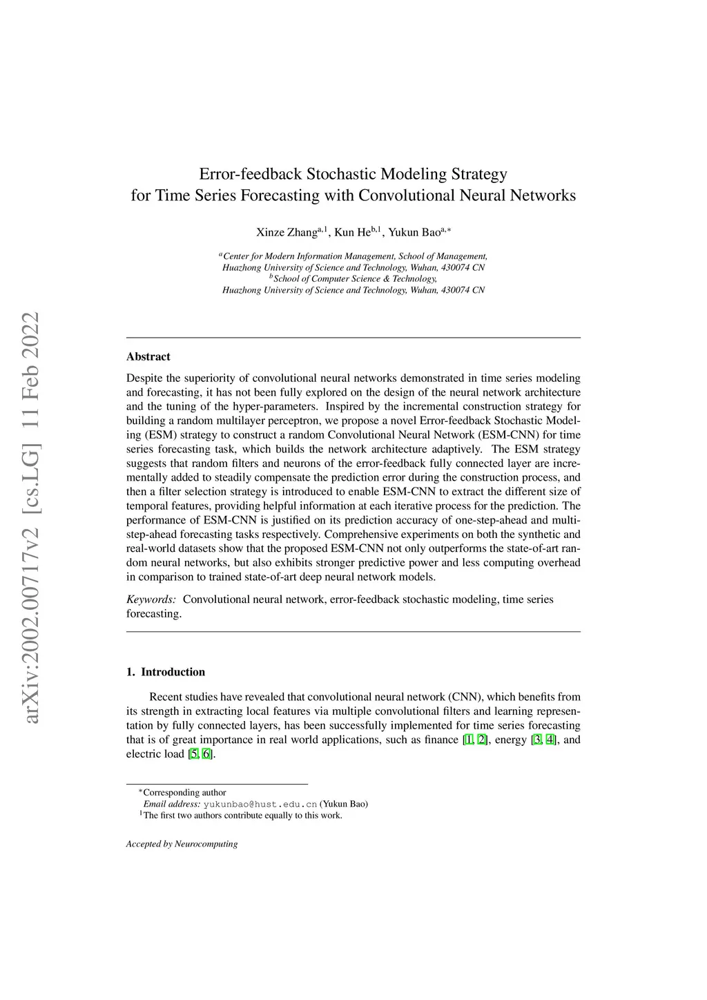 Despite the superiority of convolutional neural networks demonstrated in time series modeling and forecasting, it has not been fully explored on the design of the neural network architecture and the tuning of the hyper-parameters. Inspired by the incremental construction strategy for building a random multilayer perceptron, we propose a novel Error-feedback Stochastic Modeling (ESM) strategy to construct a random Convolutional Neural Network (ESM-CNN) for time series forecasting task, which builds the network architecture adaptively. The ESM strategy suggests that random filters and neurons of the error-feedback fully connected layer are incrementally added to steadily compensate the prediction error during the construction process, and then a filter selection strategy is introduced to enable ESM-CNN to extract the different size of temporal features, providing helpful information at each iterative process for the prediction. The performance of ESM-CNN is justified on its prediction accuracy of one-step-ahead and multi-step-ahead forecasting tasks respectively. Comprehensive experiments on both the synthetic and real-world datasets show that the proposed ESM-CNN not only outperforms the state-of-art random neural networks, but also exhibits stronger predictive power and less computing overhead in comparison to trained state-of-art deep neural network models.
