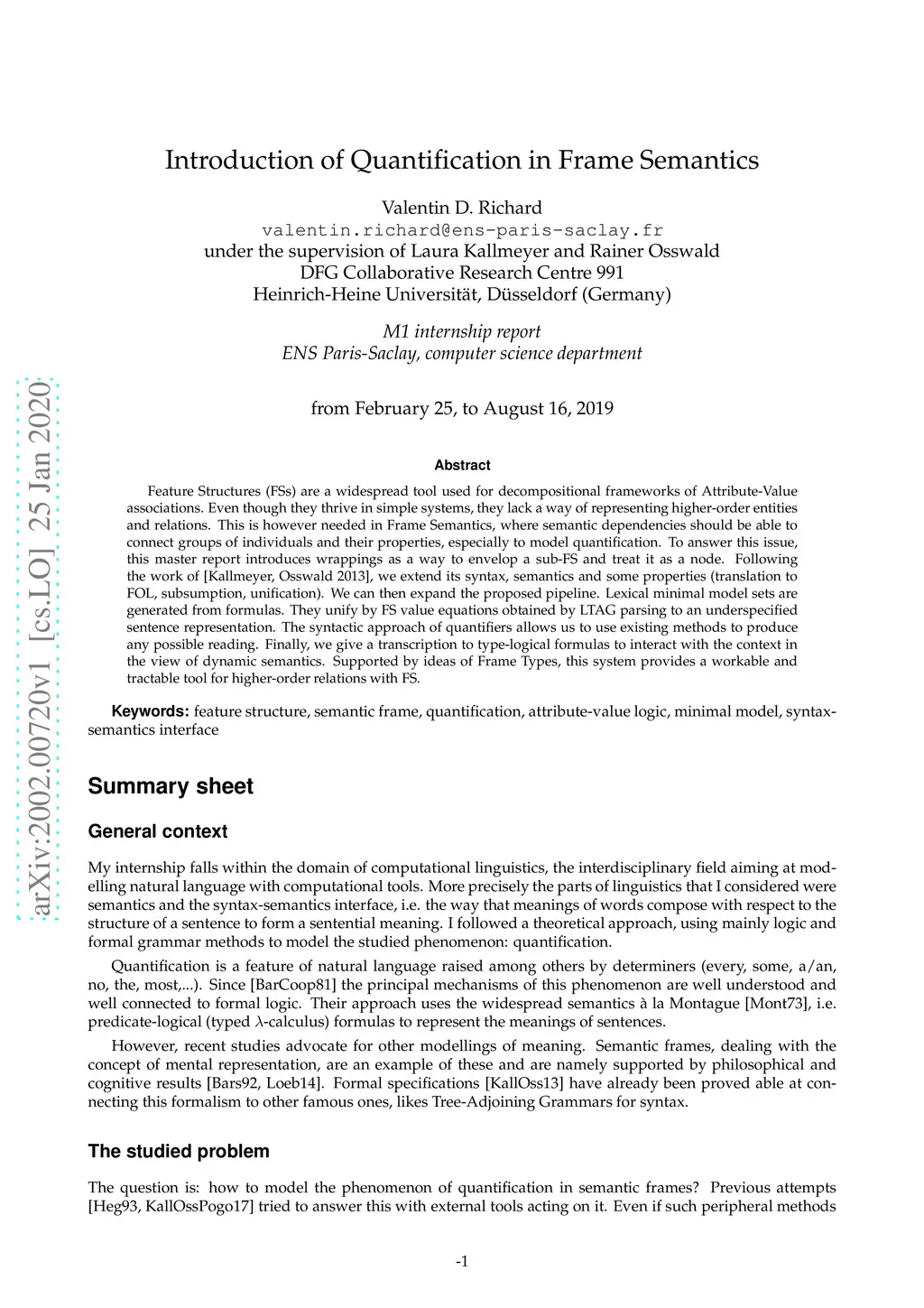 Feature Structures (FSs) are a widespread tool used for decompositional frameworks of Attribute-Value associations. Even though they thrive in simple systems, they lack a way of representing higher-order entities and relations. This is however needed in Frame Semantics, where semantic dependencies should be able to connect groups of individuals and their properties, especially to model quantification. To answer this issue, this master report introduces wrappings as a way to envelop a sub-FS and treat it as a node. Following the work of [Kallmeyer, Osswald 2013], we extend its syntax, semantics and some properties (translation to FOL, subsumption, unification). We can then expand the proposed pipeline. Lexical minimal model sets are generated from formulas. They unify by FS value equations obtained by LTAG parsing to an underspecified sentence representation. The syntactic approach of quantifiers allows us to use existing methods to produce any possible reading. Finally, we give a transcription to type-logical formulas to interact with the context in the view of dynamic semantics. Supported by ideas of Frame Types, this system provides a workable and tractable tool for higher-order relations with FS.