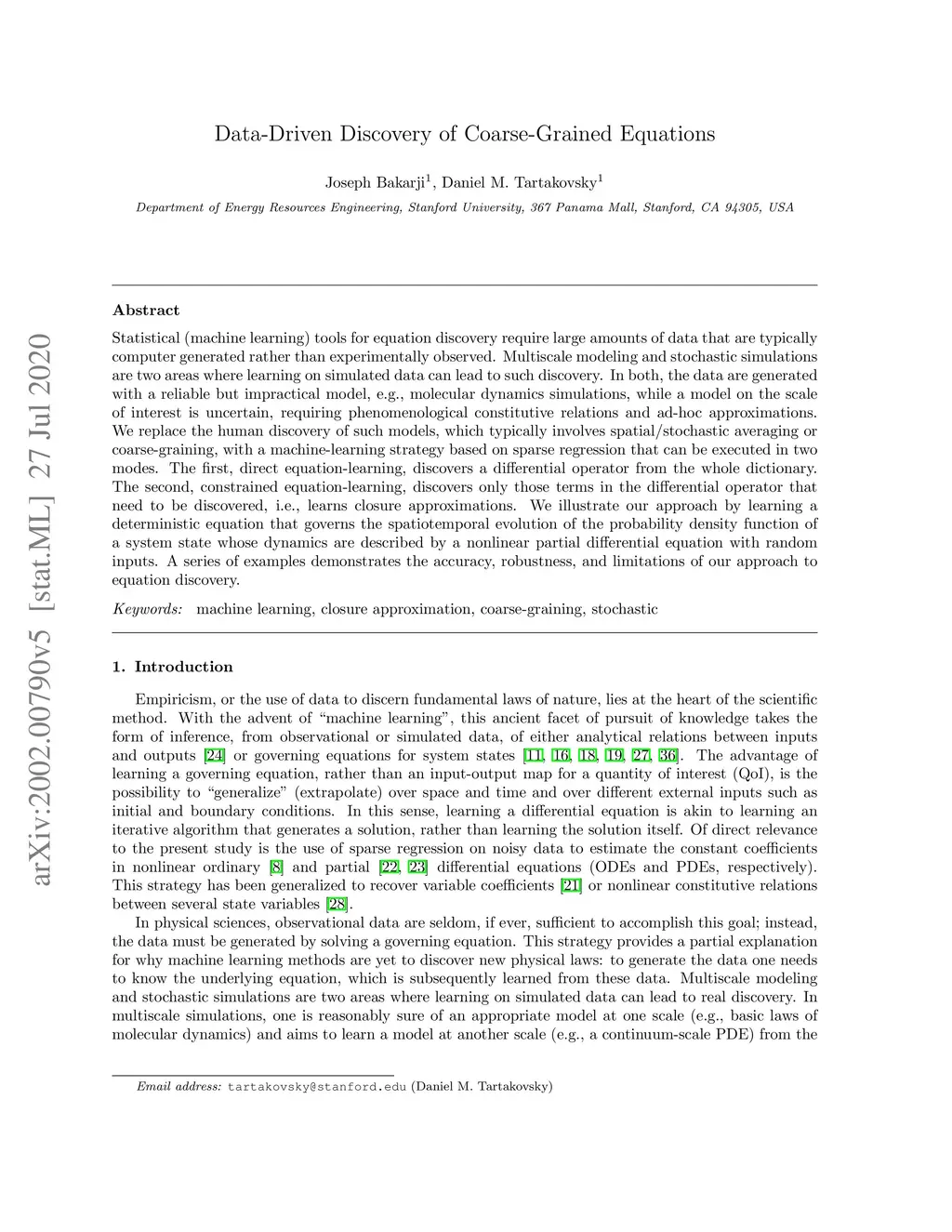 Statistical (machine learning) tools for equation discovery require large amounts of data that are typically computer generated rather than experimentally observed. Multiscale modeling and stochastic simulations are two areas where learning on simulated data can lead to such discovery. In both, the data are generated with a reliable but impractical model, e.g., molecular dynamics simulations, while a model on the scale of interest is uncertain, requiring phenomenological constitutive relations and ad-hoc approximations. We replace the human discovery of such models, which typically involves spatial/stochastic averaging or coarse-graining, with a machine-learning strategy based on sparse regression that can be executed in two modes. The first, direct equation-learning, discovers a differential operator from the whole dictionary. The second, constrained equation-learning, discovers only those terms in the differential operator that need to be discovered, i.e., learns closure approximations. We illustrate our approach by learning a deterministic equation that governs the spatiotemporal evolution of the probability density function of a system state whose dynamics are described by a nonlinear partial differential equation with random inputs. A series of examples demonstrates the accuracy, robustness, and limitations of our approach to equation discovery.