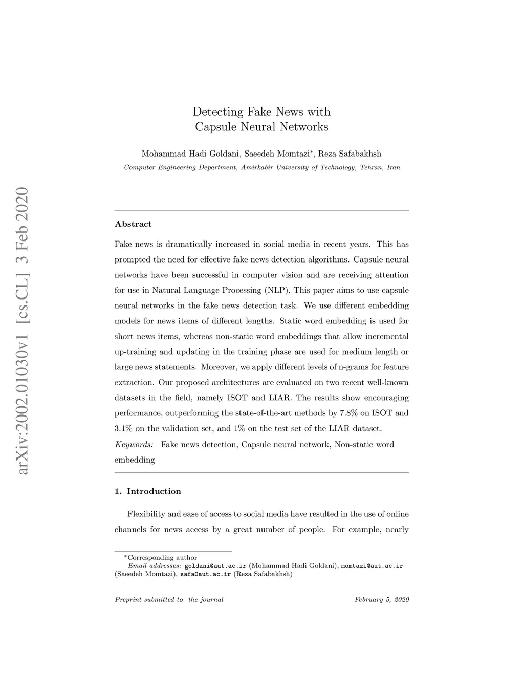Fake news is dramatically increased in social media in recent years. This has prompted the need for effective fake news detection algorithms. Capsule neural networks have been successful in computer vision and are receiving attention for use in Natural Language Processing (NLP). This paper aims to use capsule neural networks in the fake news detection task. We use different embedding models for news items of different lengths. Static word embedding is used for short news items, whereas non-static word embeddings that allow incremental up-training and updating in the training phase are used for medium length or large news statements. Moreover, we apply different levels of n-grams for feature extraction. Our proposed architectures are evaluated on two recent well-known datasets in the field, namely ISOT and LIAR. The results show encouraging performance, outperforming the state-of-the-art methods by 7.8% on ISOT and 3.1% on the validation set, and 1% on the test set of the LIAR dataset.