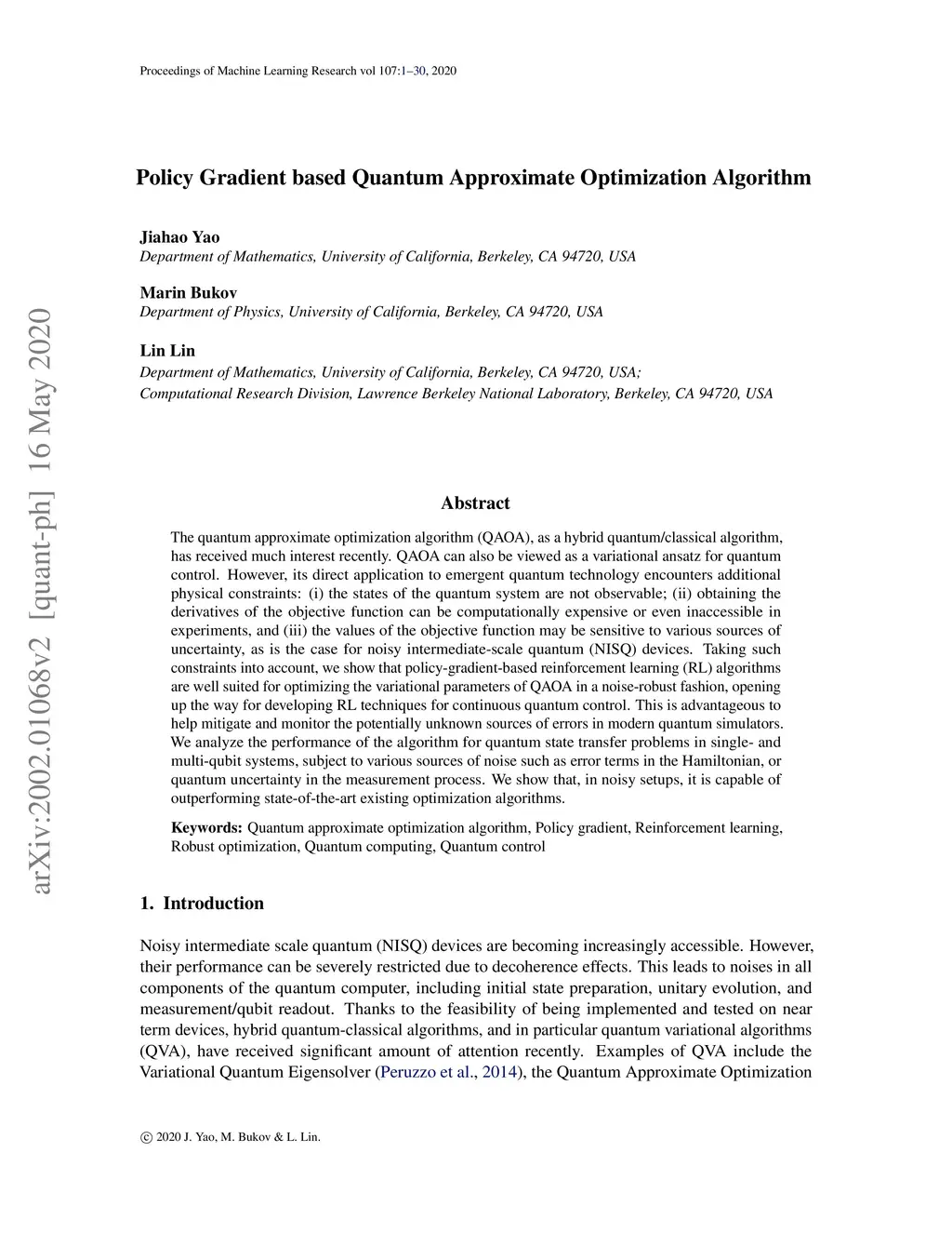 Policy Gradient based Quantum Approximate Optimization Algorithm