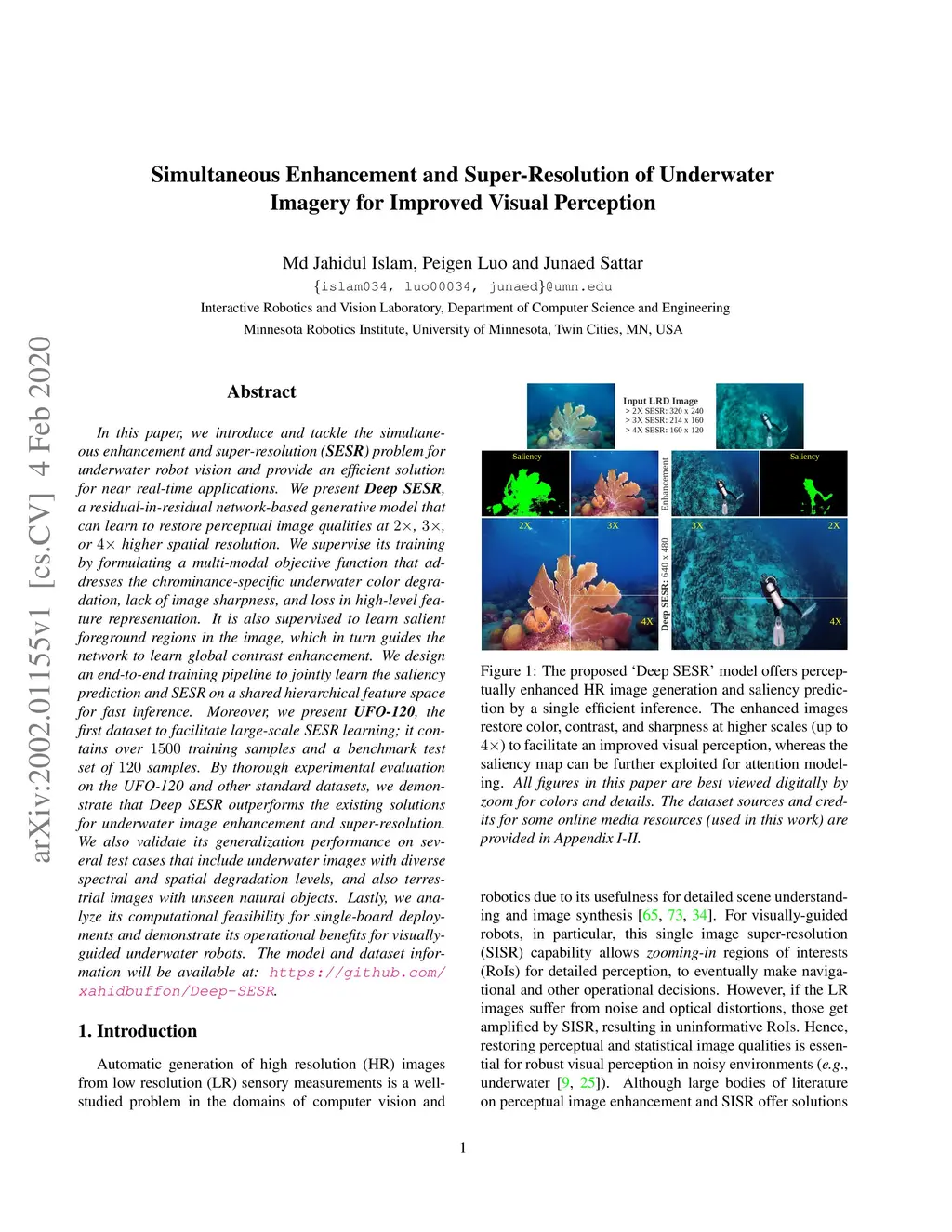 In this paper, we introduce and tackle the simultaneous enhancement and super-resolution (SESR) problem for underwater robot vision and provide an efficient solution for near real-time applications. We present Deep SESR, a residual-in-residual network-based generative model that can learn to restore perceptual image qualities at 2x, 3x, or 4x higher spatial resolution. We supervise its training by formulating a multi-modal objective function that addresses the chrominance-specific underwater color degradation, lack of image sharpness, and loss in high-level feature representation. It is also supervised to learn salient foreground regions in the image, which in turn guides the network to learn global contrast enhancement. We design an end-to-end training pipeline to jointly learn the saliency prediction and SESR on a shared hierarchical feature space for fast inference. Moreover, we present UFO-120, the first dataset to facilitate large-scale SESR learning; it contains over 1500 training samples and a benchmark test set of 120 samples. By thorough experimental evaluation on the UFO-120 and other standard datasets, we demonstrate that Deep SESR outperforms the existing solutions for underwater image enhancement and super-resolution. We also validate its generalization performance on several test cases that include underwater images with diverse spectral and spatial degradation levels, and also terrestrial images with unseen natural objects. Lastly, we analyze its computational feasibility for single-board deployments and demonstrate its operational benefits for visually-guided underwater robots. The model and dataset information will be available at: https://github.com/xahidbuffon/Deep-SESR.