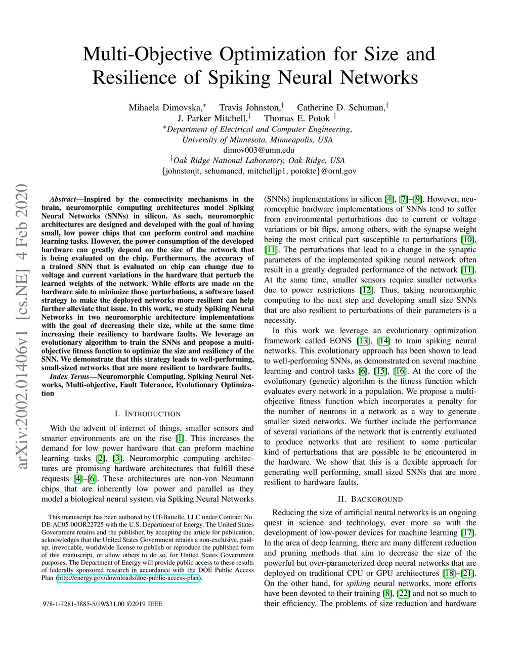 Multi-Objective Optimization for Size and Resilience of Spiking Neural