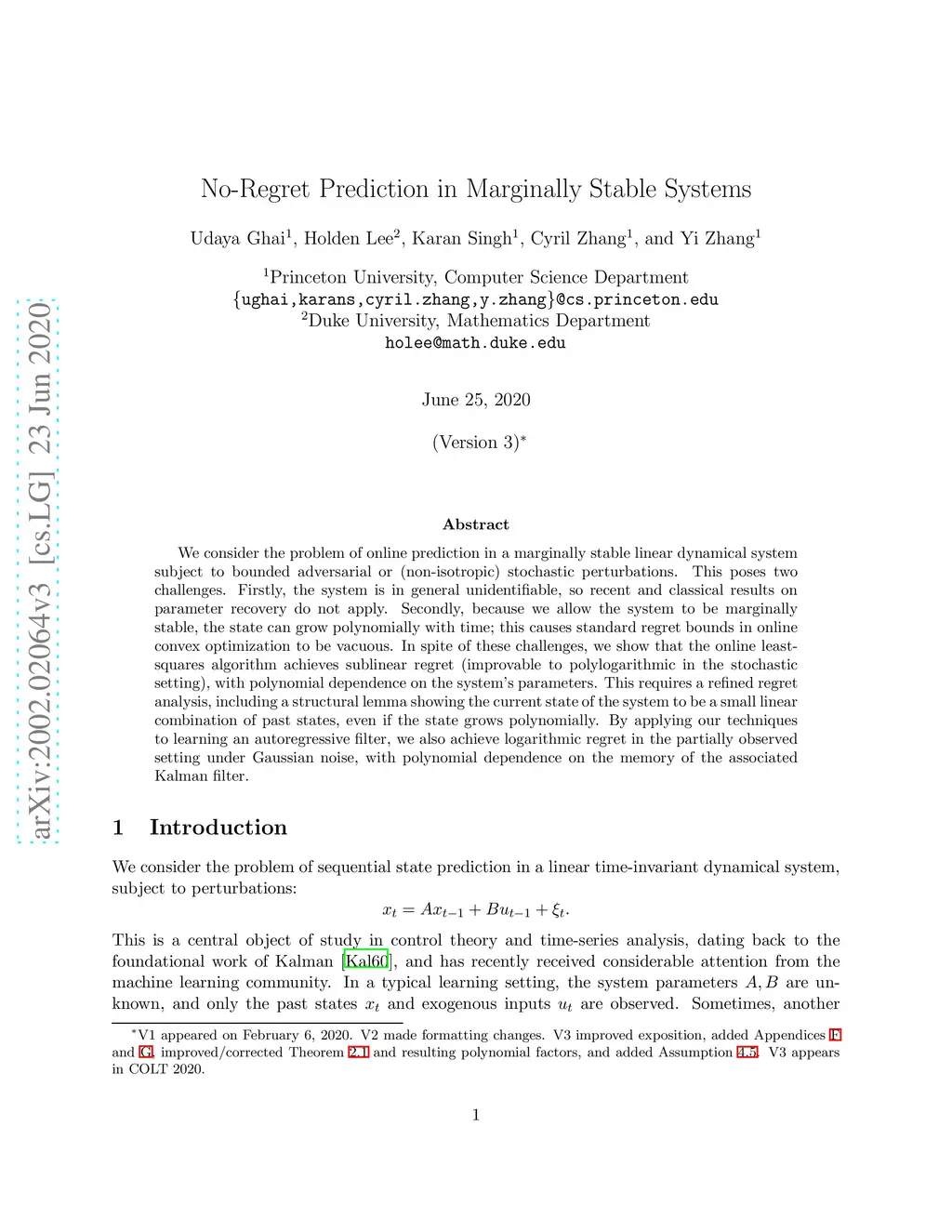 We consider the problem of online prediction in a marginally stable linear dynamical system subject to bounded adversarial or (non-isotropic) stochastic perturbations. This poses two challenges. Firstly, the system is in general unidentifiable, so recent and classical results on parameter recovery do not apply. Secondly, because we allow the system to be marginally stable, the state can grow polynomially with time; this causes standard regret bounds in online convex optimization to be vacuous. In spite of these challenges, we show that the online least-squares algorithm achieves sublinear regret (improvable to polylogarithmic in the stochastic setting), with polynomial dependence on the system's parameters. This requires a refined regret analysis, including a structural lemma showing the current state of the system to be a small linear combination of past states, even if the state grows polynomially. By applying our techniques to learning an autoregressive filter, we also achieve logarithmic regret in the partially observed setting under Gaussian noise, with polynomial dependence on the memory of the associated Kalman filter.