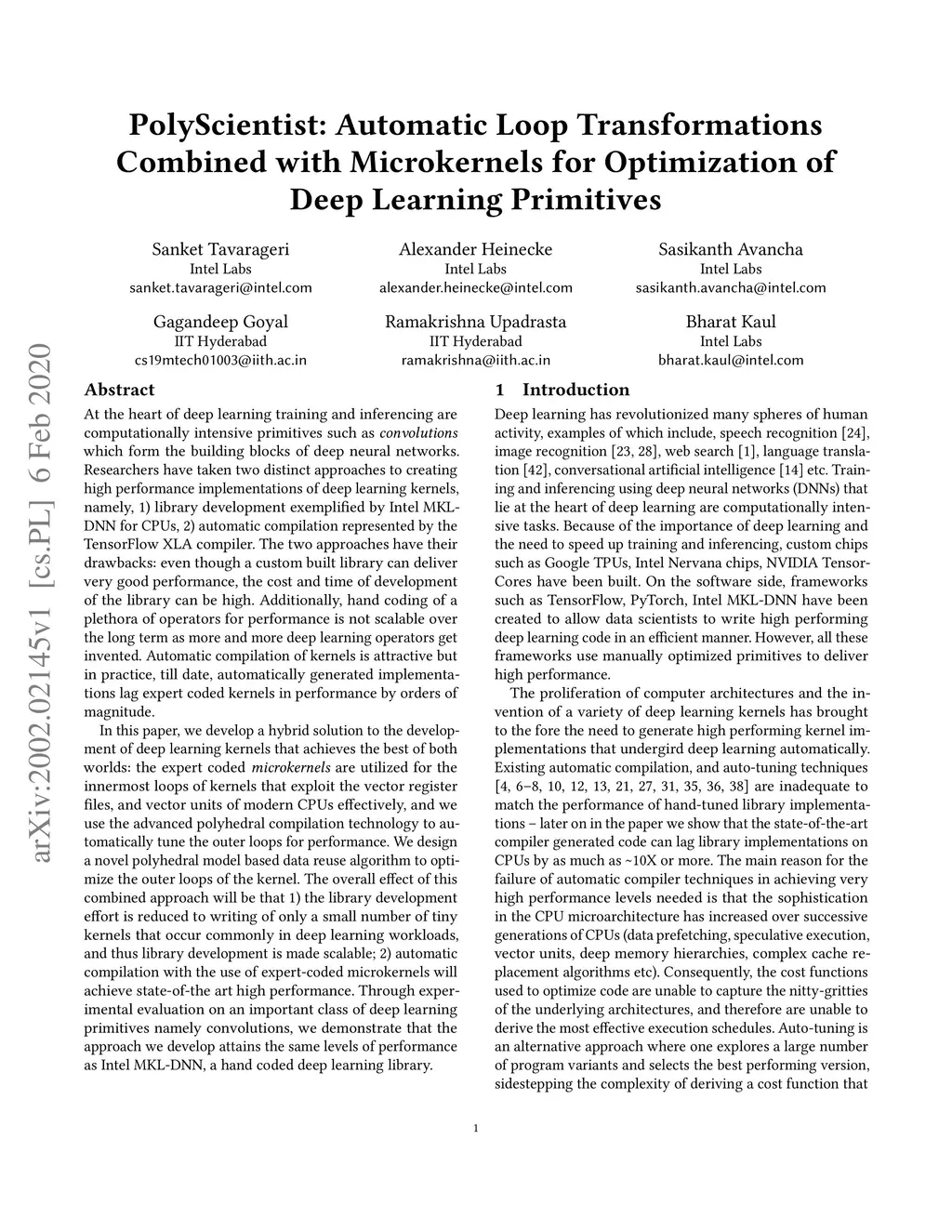 At the heart of deep learning training and inferencing are computationally intensive primitives such as convolutions which form the building blocks of deep neural networks. Researchers have taken two distinct approaches to creating high performance implementations of deep learning kernels, namely, 1) library development exemplified by Intel MKL-DNN for CPUs, 2) automatic compilation represented by the TensorFlow XLA compiler. The two approaches have their drawbacks: even though a custom built library can deliver very good performance, the cost and time of development of the library can be high. Automatic compilation of kernels is attractive but in practice, till date, automatically generated implementations lag expert coded kernels in performance by orders of magnitude. In this paper, we develop a hybrid solution to the development of deep learning kernels that achieves the best of both worlds: the expert coded microkernels are utilized for the innermost loops of kernels and we use the advanced polyhedral technology to automatically tune the outer loops for performance. We design a novel polyhedral model based data reuse algorithm to optimize the outer loops of the kernel. Through experimental evaluation on an important class of deep learning primitives namely convolutions, we demonstrate that the approach we develop attains the same levels of performance as Intel MKL-DNN, a hand coded deep learning library.