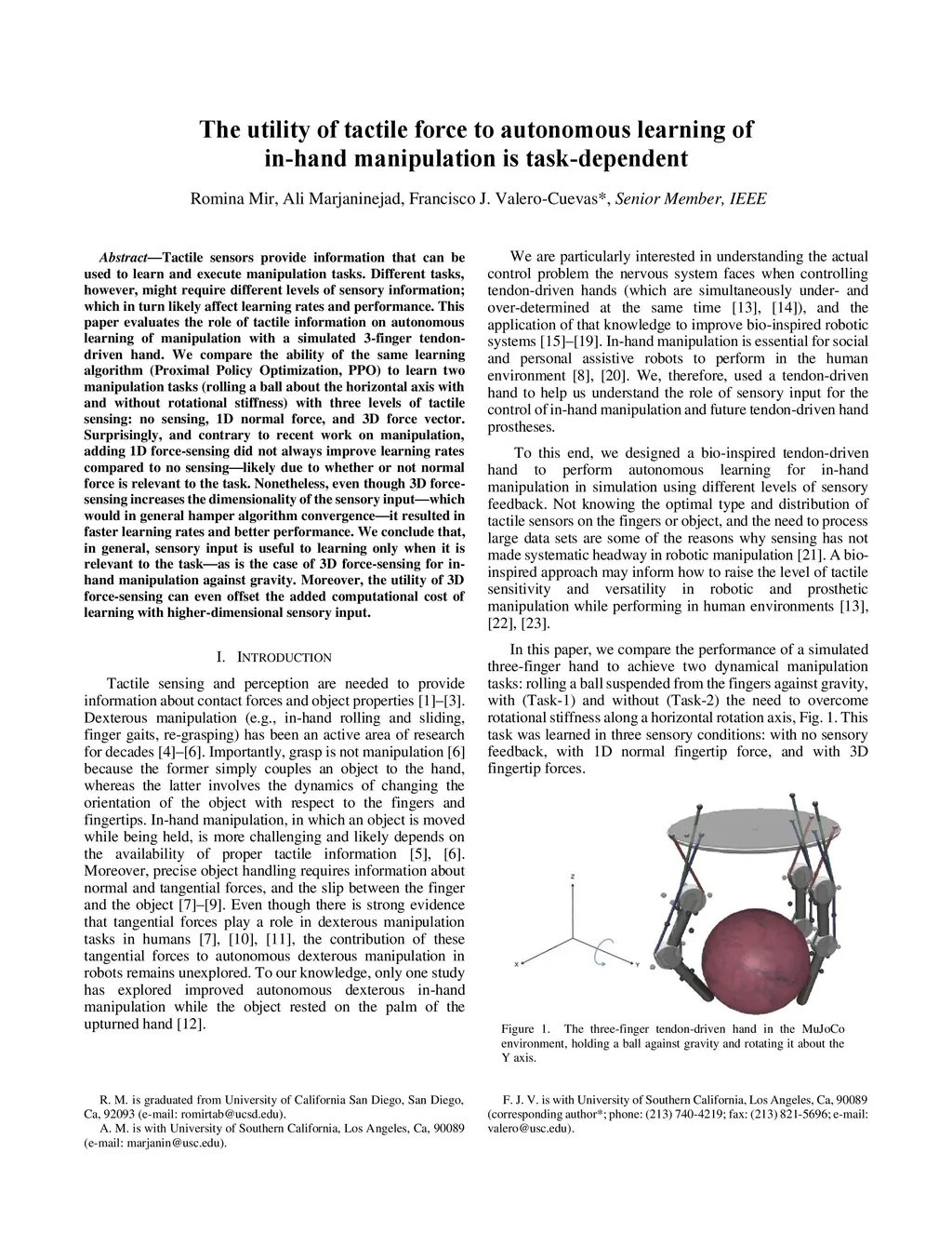 Tactile sensors provide information that can be used to learn and execute manipulation tasks. Different tasks, however, might require different levels of sensory information; which in turn likely affect learning rates and performance. This paper evaluates the role of tactile information on autonomous learning of manipulation with a simulated 3-finger tendon-driven hand. We compare the ability of the same learning algorithm (Proximal Policy Optimization, PPO) to learn two manipulation tasks (rolling a ball about the horizontal axis with and without rotational stiffness) with three levels of tactile sensing: no sensing, 1D normal force, and 3D force vector. Surprisingly, and contrary to recent work on manipulation, adding 1D force-sensing did not always improve learning rates compared to no sensing---likely due to whether or not normal force is relevant to the task. Nonetheless, even though 3D force-sensing increases the dimensionality of the sensory input---which would in general hamper algorithm convergence---it resulted in faster learning rates and better performance. We conclude that, in general, sensory input is useful to learning only when it is relevant to the task---as is the case of 3D force-sensing for in-hand manipulation against gravity. Moreover, the utility of 3D force-sensing can even offset the added computational cost of learning with higher-dimensional sensory input.