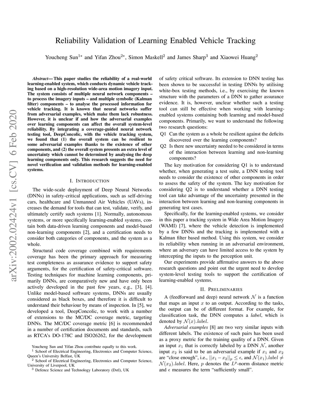 This paper studies the reliability of a real-world learning-enabled system, which conducts dynamic vehicle tracking based on a high-resolution wide-area motion imagery input. The system consists of multiple neural network components -- to process the imagery inputs -- and multiple symbolic (Kalman filter) components -- to analyse the processed information for vehicle tracking. It is known that neural networks suffer from adversarial examples, which make them lack robustness. However, it is unclear if and how the adversarial examples over learning components can affect the overall system-level reliability. By integrating a coverage-guided neural network testing tool, DeepConcolic, with the vehicle tracking system, we found that (1) the overall system can be resilient to some adversarial examples thanks to the existence of other components, and (2) the overall system presents an extra level of uncertainty which cannot be determined by analysing the deep learning components only. This research suggests the need for novel verification and validation methods for learning-enabled systems.