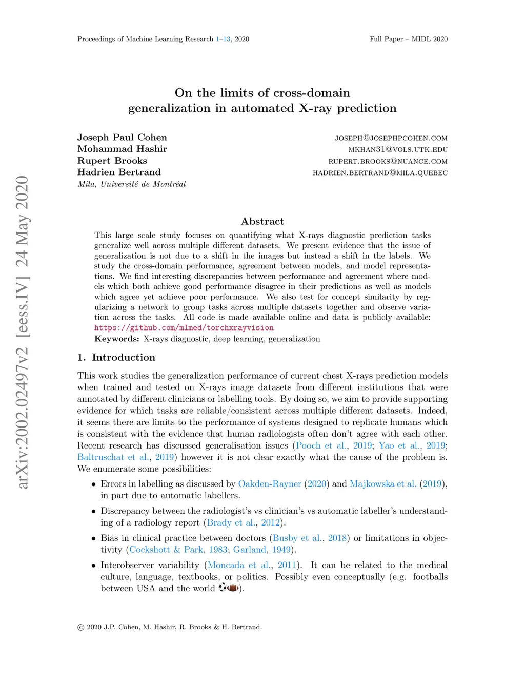 This large scale study focuses on quantifying what X-rays diagnostic prediction tasks generalize well across multiple different datasets. We present evidence that the issue of generalization is not due to a shift in the images but instead a shift in the labels. We study the cross-domain performance, agreement between models, and model representations. We find interesting discrepancies between performance and agreement where models which both achieve good performance disagree in their predictions as well as models which agree yet achieve poor performance. We also test for concept similarity by regularizing a network to group tasks across multiple datasets together and observe variation across the tasks. All code is made available online and data is publicly available: https://github.com/mlmed/torchxrayvision
