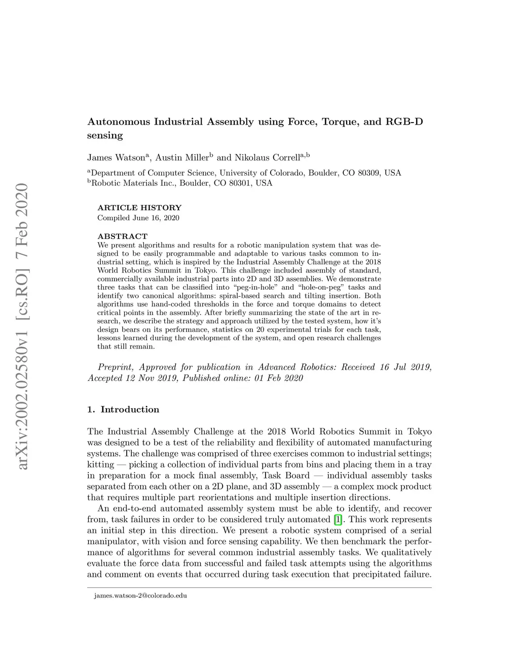 Autonomous Industrial Assembly using Force, Torque, and RGB-D sensing