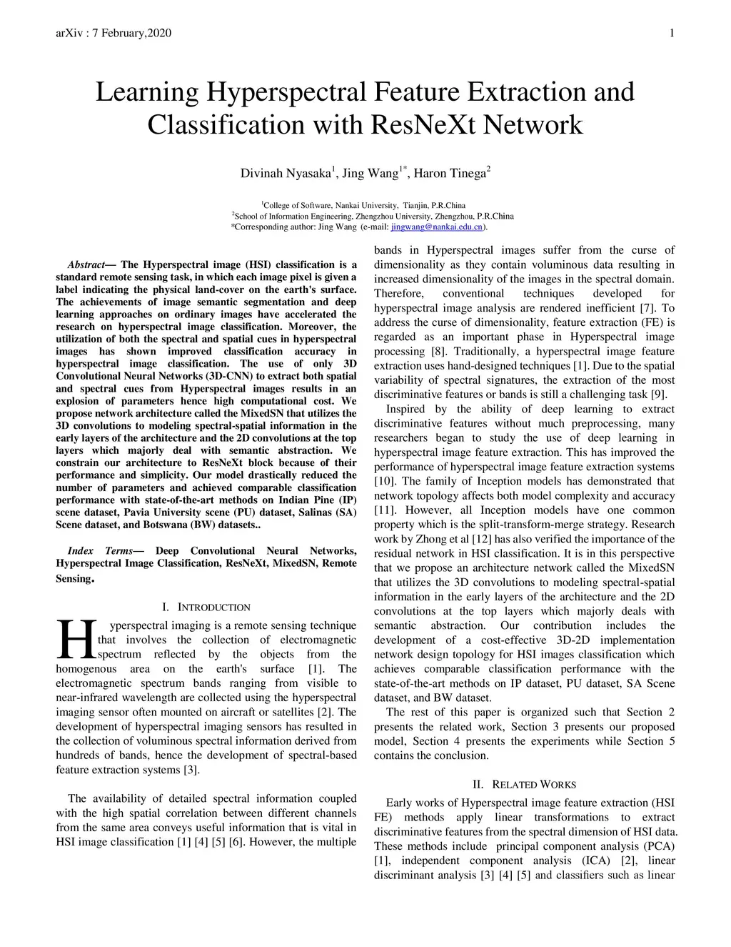 The Hyperspectral image (HSI) classification is a standard remote sensing task, in which each image pixel is given a label indicating the physical land-cover on the earth's surface. The achievements of image semantic segmentation and deep learning approaches on ordinary images have accelerated the research on hyperspectral image classification. Moreover, the utilization of both the spectral and spatial cues in hyperspectral images has shown improved classification accuracy in hyperspectral image classification. The use of only 3D Convolutional Neural Networks (3D-CNN) to extract both spatial and spectral cues from Hyperspectral images results in an explosion of parameters hence high computational cost. We propose network architecture called the MixedSN that utilizes the 3D convolutions to modeling spectral-spatial information in the early layers of the architecture and the 2D convolutions at the top layers which majorly deal with semantic abstraction. We constrain our architecture to ResNeXt block because of their performance and simplicity. Our model drastically reduced the number of parameters and achieved comparable classification performance with state-of-the-art methods on Indian Pine (IP) scene dataset, Pavia University scene (PU) dataset, Salinas (SA) Scene dataset, and Botswana (BW) dataset.