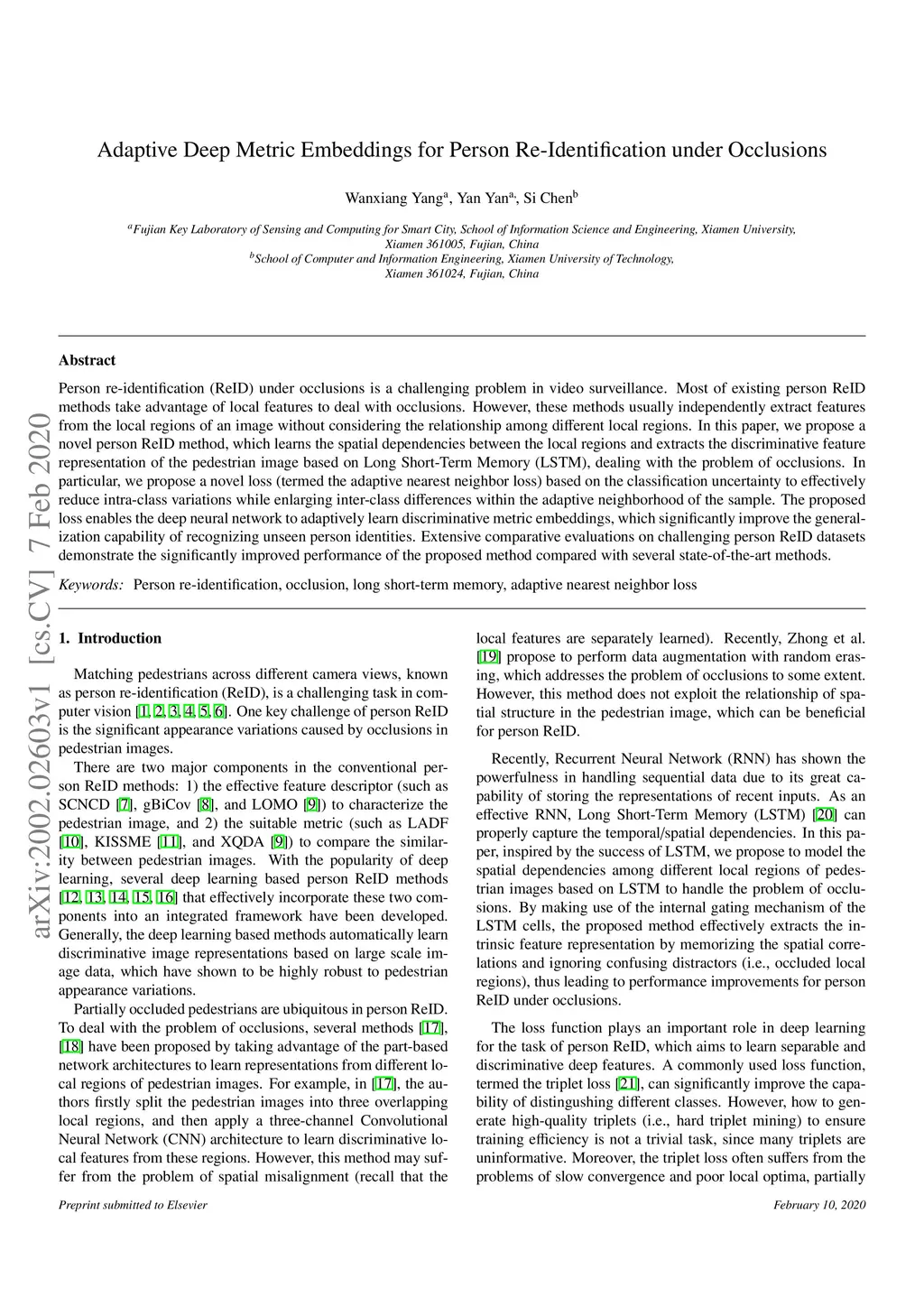 Person re-identification (ReID) under occlusions is a challenging problem in video surveillance. Most of existing person ReID methods take advantage of local features to deal with occlusions. However, these methods usually independently extract features from the local regions of an image without considering the relationship among different local regions. In this paper, we propose a novel person ReID method, which learns the spatial dependencies between the local regions and extracts the discriminative feature representation of the pedestrian image based on Long Short-Term Memory (LSTM), dealing with the problem of occlusions. In particular, we propose a novel loss (termed the adaptive nearest neighbor loss) based on the classification uncertainty to effectively reduce intra-class variations while enlarging inter-class differences within the adaptive neighborhood of the sample. The proposed loss enables the deep neural network to adaptively learn discriminative metric embeddings, which significantly improve the generalization capability of recognizing unseen person identities. Extensive comparative evaluations on challenging person ReID datasets demonstrate the significantly improved performance of the proposed method compared with several state-of-the-art methods.