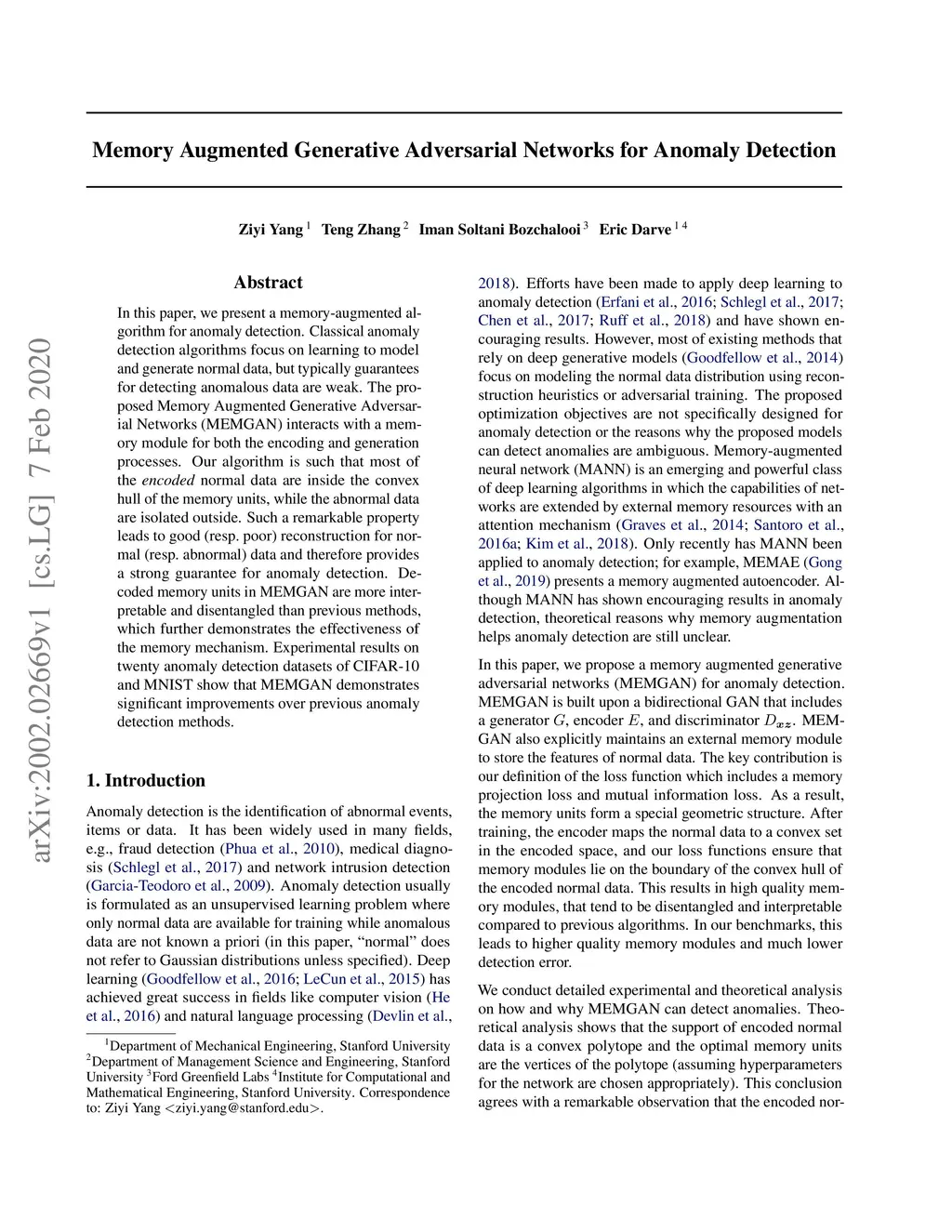 In this paper, we present a memory-augmented algorithm for anomaly detection. Classical anomaly detection algorithms focus on learning to model and generate normal data, but typically guarantees for detecting anomalous data are weak. The proposed Memory Augmented Generative Adversarial Networks (MEMGAN) interacts with a memory module for both the encoding and generation processes. Our algorithm is such that most of the \textit{encoded} normal data are inside the convex hull of the memory units, while the abnormal data are isolated outside. Such a remarkable property leads to good (resp.\ poor) reconstruction for normal (resp.\ abnormal) data and therefore provides a strong guarantee for anomaly detection. Decoded memory units in MEMGAN are more interpretable and disentangled than previous methods, which further demonstrates the effectiveness of the memory mechanism. Experimental results on twenty anomaly detection datasets of CIFAR-10 and MNIST show that MEMGAN demonstrates significant improvements over previous anomaly detection methods.