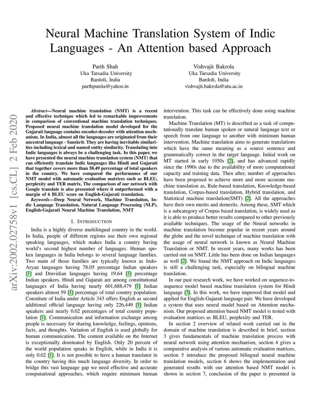 Neural machine translation (NMT) is a recent and effective technique which led to remarkable improvements in comparison of conventional machine translation techniques. Proposed neural machine translation model developed for the Gujarati language contains encoder-decoder with attention mechanism. In India, almost all the languages are originated from their ancestral language - Sanskrit. They are having inevitable similarities including lexical and named entity similarity. Translating into Indic languages is always be a challenging task. In this paper, we have presented the neural machine translation system (NMT) that can efficiently translate Indic languages like Hindi and Gujarati that together covers more than 58.49 percentage of total speakers in the country. We have compared the performance of our NMT model with automatic evaluation matrices such as BLEU, perplexity and TER matrix. The comparison of our network with Google translate is also presented where it outperformed with a margin of 6 BLEU score on English-Gujarati translation.