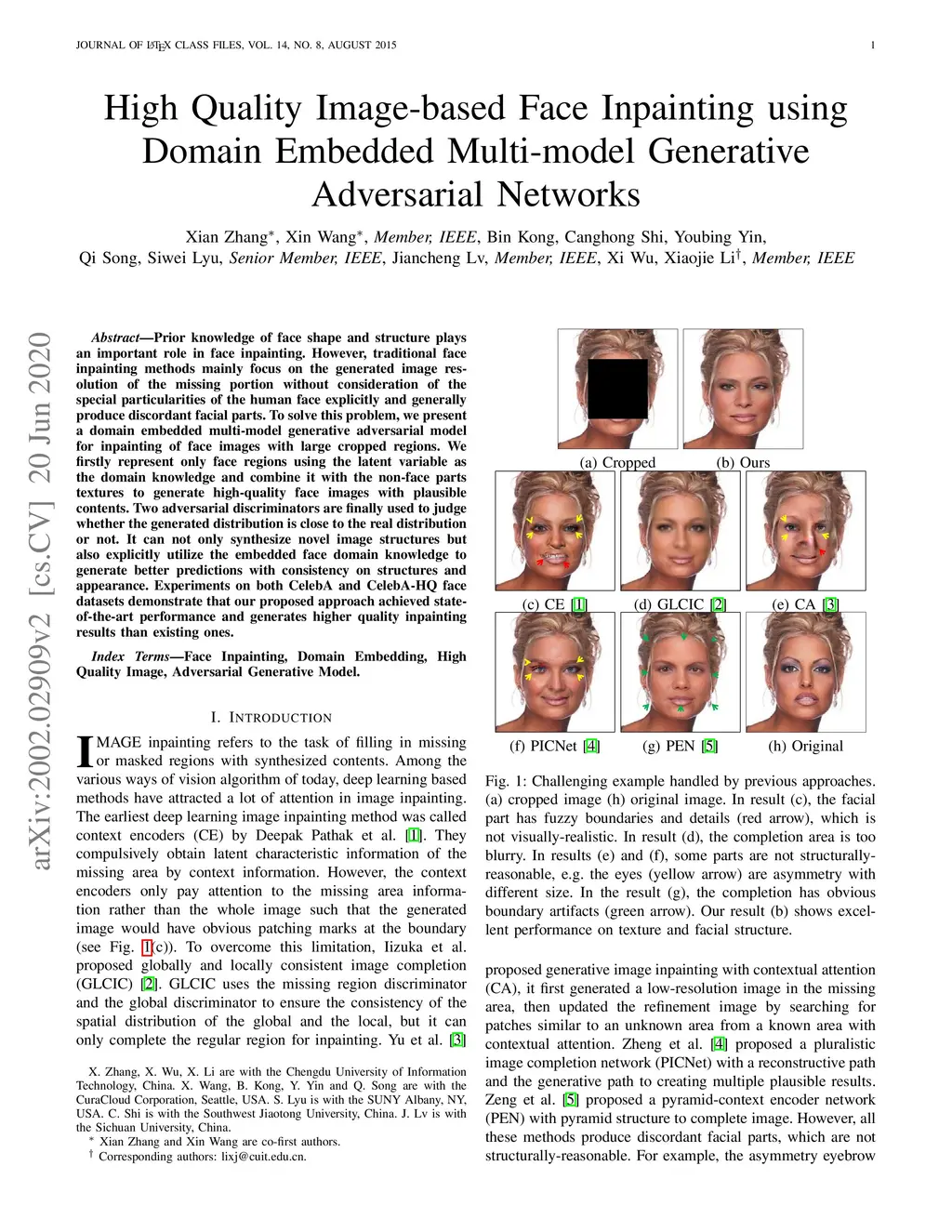 Prior knowledge of face shape and structure plays an important role in face inpainting. However, traditional face inpainting methods mainly focus on the generated image resolution of the missing portion without consideration of the special particularities of the human face explicitly and generally produce discordant facial parts. To solve this problem, we present a domain embedded multi-model generative adversarial model for inpainting of face images with large cropped regions. We firstly represent only face regions using the latent variable as the domain knowledge and combine it with the non-face parts textures to generate high-quality face images with plausible contents. Two adversarial discriminators are finally used to judge whether the generated distribution is close to the real distribution or not. It can not only synthesize novel image structures but also explicitly utilize the embedded face domain knowledge to generate better predictions with consistency on structures and appearance. Experiments on both CelebA and CelebA-HQ face datasets demonstrate that our proposed approach achieved state-of-the-art performance and generates higher quality inpainting results than existing ones.