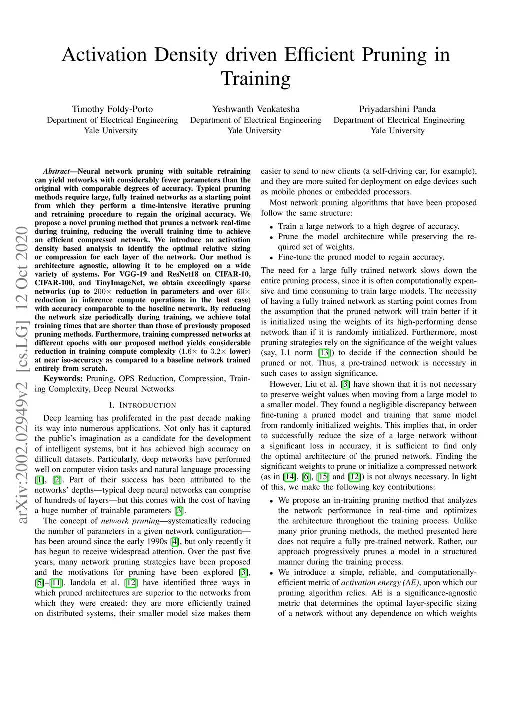 Neural network pruning with suitable retraining can yield networks with considerably fewer parameters than the original with comparable degrees of accuracy. Typical pruning methods require large, fully trained networks as a starting point from which they perform a time-intensive iterative pruning and retraining procedure to regain the original accuracy. We propose a novel pruning method that prunes a network real-time during training, reducing the overall training time to achieve an efficient compressed network. We introduce an activation density based analysis to identify the optimal relative sizing or compression for each layer of the network. Our method is architecture agnostic, allowing it to be employed on a wide variety of systems. For VGG-19 and ResNet18 on CIFAR-10, CIFAR-100, and TinyImageNet, we obtain exceedingly sparse networks (up to reduction in parameters and over reduction in inference compute operations in the best case) with accuracy comparable to the baseline network. By reducing the network size periodically during training, we achieve total training times that are shorter than those of previously proposed pruning methods. Furthermore, training compressed networks at different epochs with our proposed method yields considerable reduction in training compute complexity ( to lower) at near iso-accuracy as compared to a baseline network trained entirely from scratch.