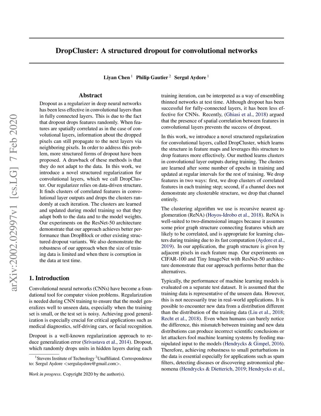 Dropout as a common regularizer to prevent overfitting in deep neural networks has been less effective in convolutional layers than in fully connected layers. This is because Dropout drops features randomly, without considering local structure. When features are spatially correlated, as in the case of convolutional layers, information from the dropped features can still propagate to subsequent layers via neighboring features. To address this problem, structured forms of Dropout have been proposed. A drawback of these methods is that they do not adapt to the data. In this work, we leverage the structure in the outputs of convolutional layers and introduce a novel structured regularization method named DropCluster. Our approach clusters features in convolutional layers, and drops the resulting clusters randomly during training iterations. Experiments on CIFAR-10/100, SVHN, and APPA-REAL datasets demonstrate that our approach is effective and controls overfitting better than other approaches.