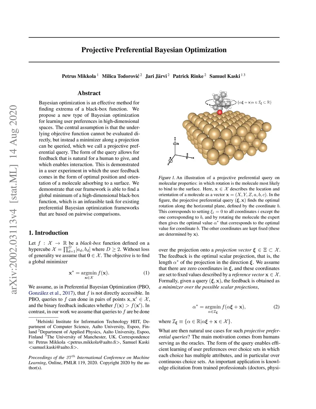 Bayesian optimization is an effective method for finding extrema of a black-box function. We propose a new type of Bayesian optimization for learning user preferences in high-dimensional spaces. The central assumption is that the underlying objective function cannot be evaluated directly, but instead a minimizer along a projection can be queried, which we call a projective preferential query. The form of the query allows for feedback that is natural for a human to give, and which enables interaction. This is demonstrated in a user experiment in which the user feedback comes in the form of optimal position and orientation of a molecule adsorbing to a surface. We demonstrate that our framework is able to find a global minimum of a high-dimensional black-box function, which is an infeasible task for existing preferential Bayesian optimization frameworks that are based on pairwise comparisons.