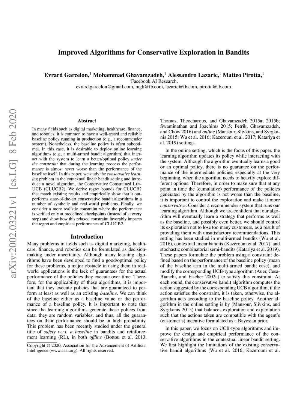 In many fields such as digital marketing, healthcare, finance, and robotics, it is common to have a well-tested and reliable baseline policy running in production (e.g., a recommender system). Nonetheless, the baseline policy is often suboptimal. In this case, it is desirable to deploy online learning algorithms (e.g., a multi-armed bandit algorithm) that interact with the system to learn a better/optimal policy under the constraint that during the learning process the performance is almost never worse than the performance of the baseline itself. In this paper, we study the conservative learning problem in the contextual linear bandit setting and introduce a novel algorithm, the Conservative Constrained LinUCB (CLUCB2). We derive regret bounds for CLUCB2 that match existing results and empirically show that it outperforms state-of-the-art conservative bandit algorithms in a number of synthetic and real-world problems. Finally, we consider a more realistic constraint where the performance is verified only at predefined checkpoints (instead of at every step) and show how this relaxed constraint favorably impacts the regret and empirical performance of CLUCB2.