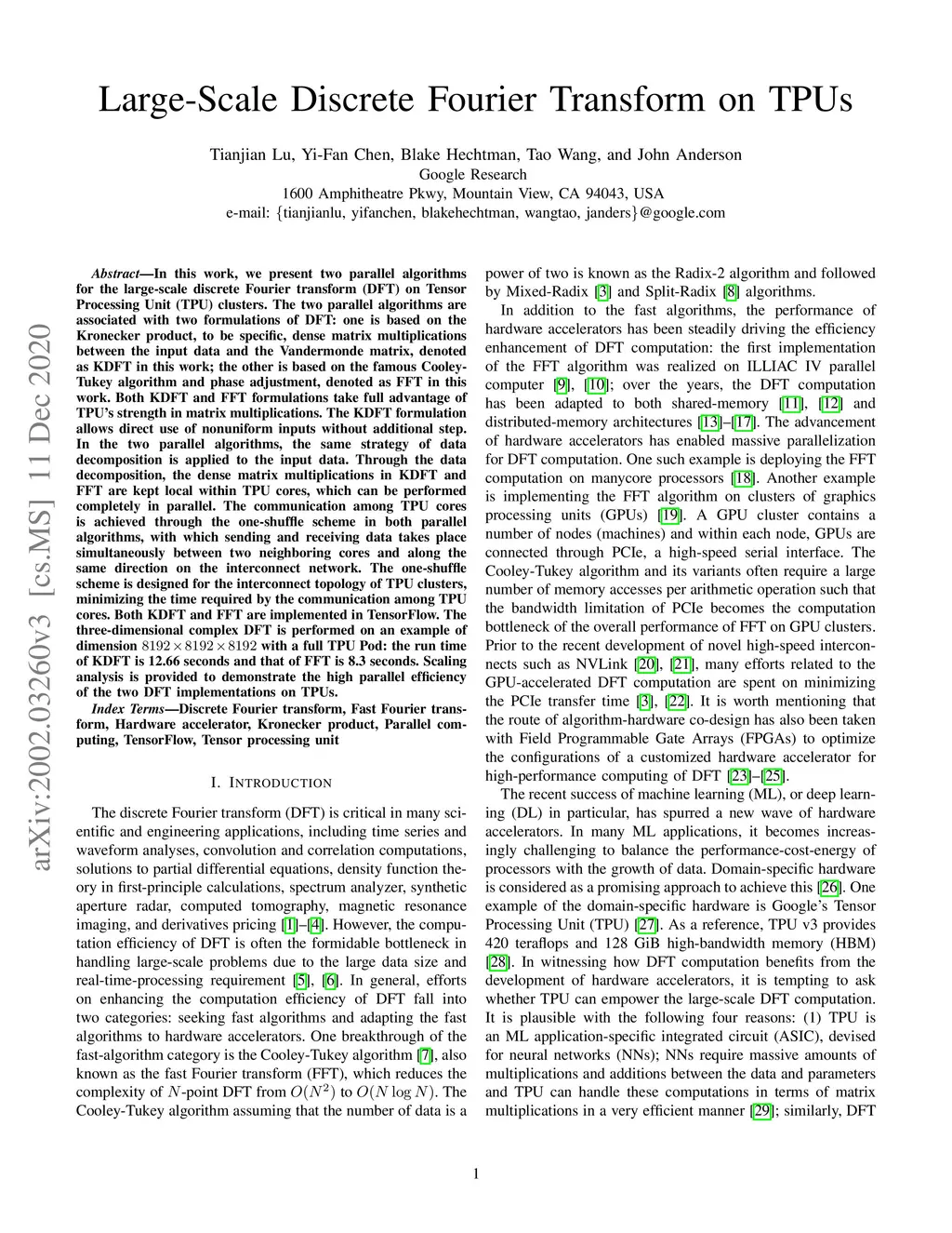In this work, we present two parallel algorithms for the large-scale discrete Fourier transform (DFT) on Tensor Processing Unit (TPU) clusters. The two parallel algorithms are associated with two formulations of DFT: one is based on the Kronecker product, to be specific, dense matrix multiplications between the input data and the Vandermonde matrix, denoted as KDFT in this work; the other is based on the famous Cooley-Tukey algorithm and phase adjustment, denoted as FFT in this work. Both KDFT and FFT formulations take full advantage of TPU's strength in matrix multiplications. The KDFT formulation allows direct use of nonuniform inputs without additional step. In the two parallel algorithms, the same strategy of data decomposition is applied to the input data. Through the data decomposition, the dense matrix multiplications in KDFT and FFT are kept local within TPU cores, which can be performed completely in parallel. The communication among TPU cores is achieved through the one-shuffle scheme in both parallel algorithms, with which sending and receiving data takes place simultaneously between two neighboring cores and along the same direction on the interconnect network. The one-shuffle scheme is designed for the interconnect topology of TPU clusters, minimizing the time required by the communication among TPU cores. Both KDFT and FFT are implemented in TensorFlow. The three-dimensional complex DFT is performed on an example of dimension with a full TPU Pod: the run time of KDFT is 12.66 seconds and that of FFT is 8.3 seconds. Scaling analysis is provided to demonstrate the high parallel efficiency of the two DFT implementations on TPUs.