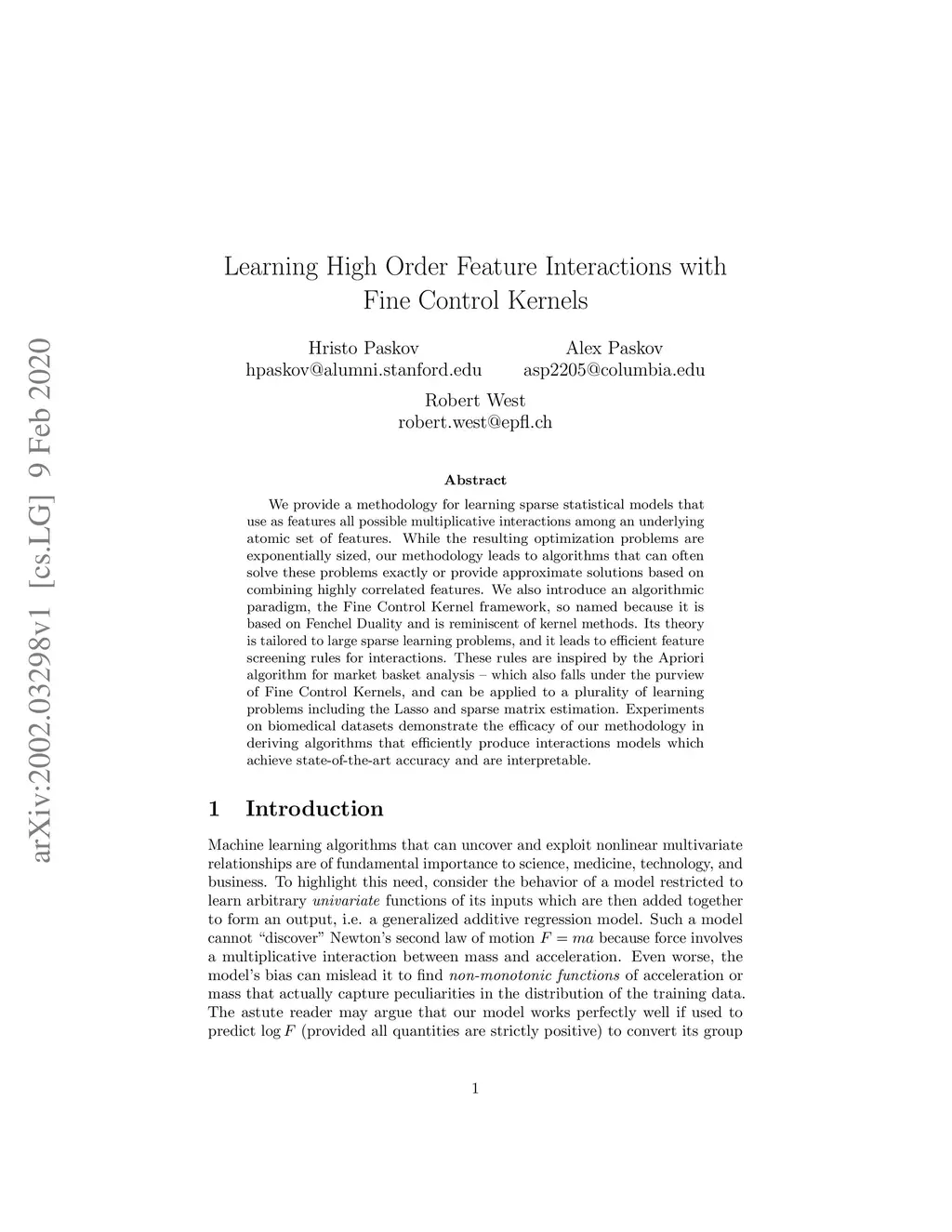We provide a methodology for learning sparse statistical models that use as features all possible multiplicative interactions among an underlying atomic set of features. While the resulting optimization problems are exponentially sized, our methodology leads to algorithms that can often solve these problems exactly or provide approximate solutions based on combining highly correlated features. We also introduce an algorithmic paradigm, the Fine Control Kernel framework, so named because it is based on Fenchel Duality and is reminiscent of kernel methods. Its theory is tailored to large sparse learning problems, and it leads to efficient feature screening rules for interactions. These rules are inspired by the Apriori algorithm for market basket analysis -- which also falls under the purview of Fine Control Kernels, and can be applied to a plurality of learning problems including the Lasso and sparse matrix estimation. Experiments on biomedical datasets demonstrate the efficacy of our methodology in deriving algorithms that efficiently produce interactions models which achieve state-of-the-art accuracy and are interpretable.