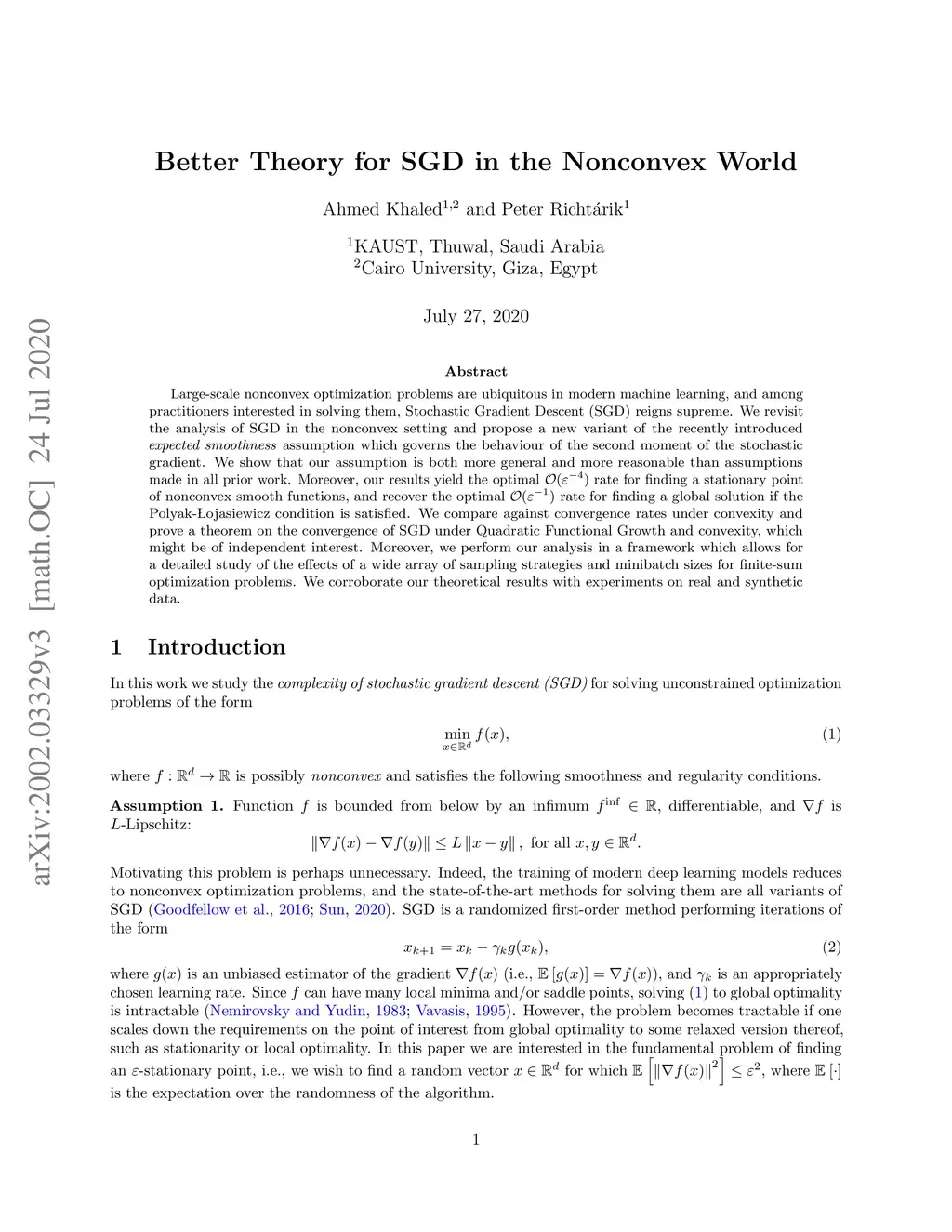 Large-scale nonconvex optimization problems are ubiquitous in modern machine learning, and among practitioners interested in solving them, Stochastic Gradient Descent (SGD) reigns supreme. We revisit the analysis of SGD in the nonconvex setting and propose a new variant of the recently introduced expected smoothness assumption which governs the behaviour of the second moment of the stochastic gradient. We show that our assumption is both more general and more reasonable than assumptions made in all prior work. Moreover, our results yield the optimal rate for finding a stationary point of nonconvex smooth functions, and recover the optimal rate for finding a global solution if the Polyak-{\L}ojasiewicz condition is satisfied. We compare against convergence rates under convexity and prove a theorem on the convergence of SGD under Quadratic Functional Growth and convexity, which might be of independent interest. Moreover, we perform our analysis in a framework which allows for a detailed study of the effects of a wide array of sampling strategies and minibatch sizes for finite-sum optimization problems. We corroborate our theoretical results with experiments on real and synthetic data.