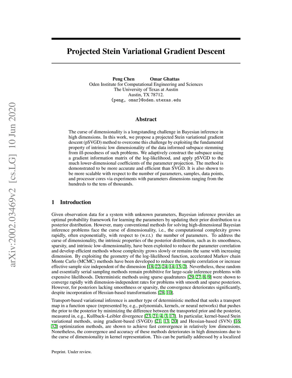 The curse of dimensionality is a longstanding challenge in Bayesian inference in high dimensions. In this work, we propose a projected Stein variational gradient descent (pSVGD) method to overcome this challenge by exploiting the fundamental property of intrinsic low dimensionality of the data informed subspace stemming from ill-posedness of such problems. We adaptively construct the subspace using a gradient information matrix of the log-likelihood, and apply pSVGD to the much lower-dimensional coefficients of the parameter projection. The method is demonstrated to be more accurate and efficient than SVGD. It is also shown to be more scalable with respect to the number of parameters, samples, data points, and processor cores via experiments with parameters dimensions ranging from the hundreds to the tens of thousands.