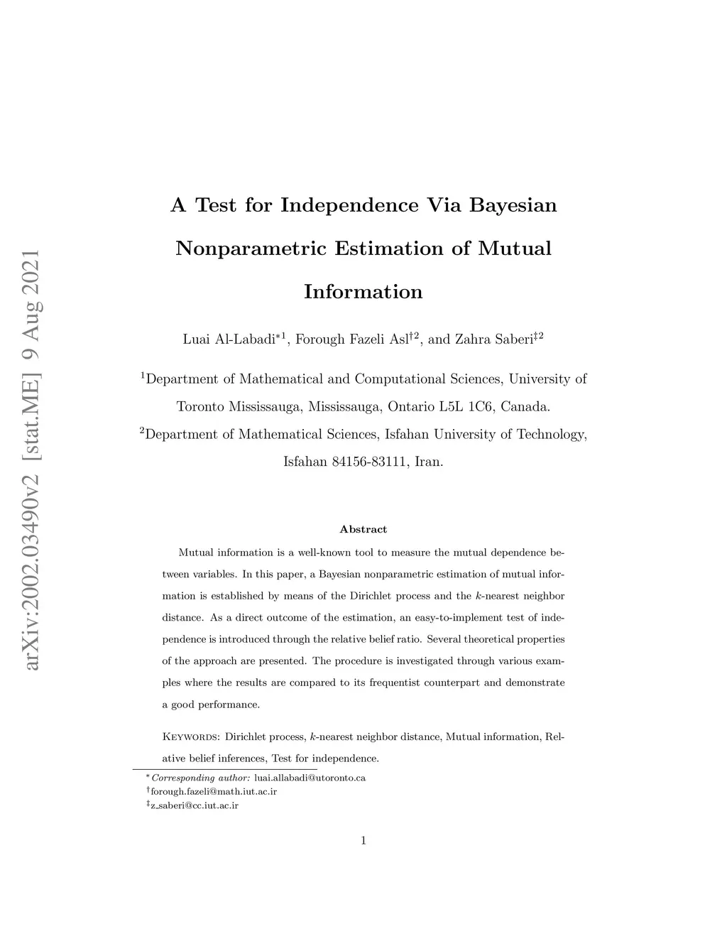 Mutual information is a well-known tool to measure the mutual dependence between variables. In this paper, a Bayesian nonparametric estimation of mutual information is established by means of the Dirichlet process and the -nearest neighbor distance. As a direct outcome of the estimation, an easy-to-implement test of independence is introduced through the relative belief ratio. Several theoretical properties of the approach are presented. The procedure is investigated through various examples where the results are compared to its frequentist counterpart and demonstrate a good performance.