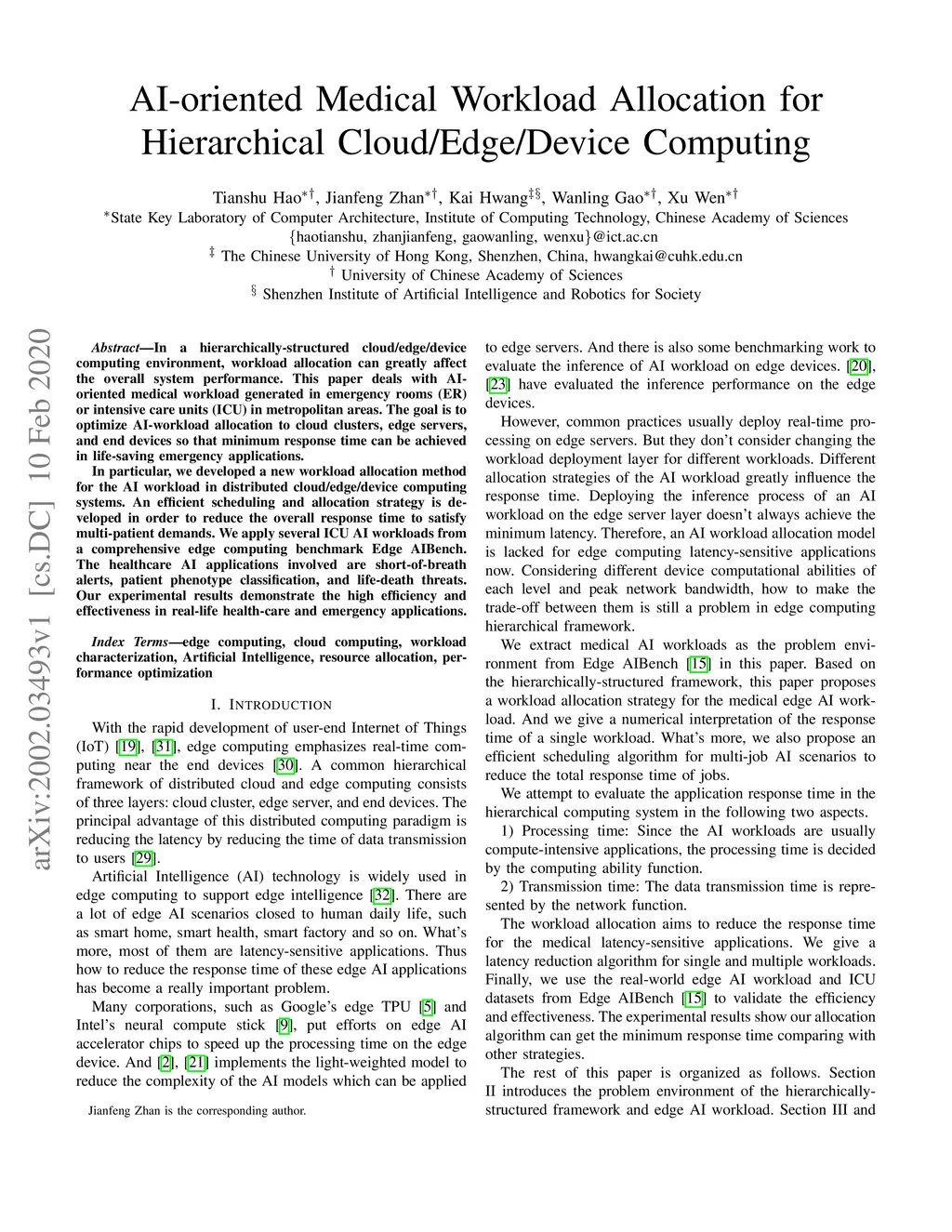 In a hierarchically-structured cloud/edge/device computing environment, workload allocation can greatly affect the overall system performance. This paper deals with AI-oriented medical workload generated in emergency rooms (ER) or intensive care units (ICU) in metropolitan areas. The goal is to optimize AI-workload allocation to cloud clusters, edge servers, and end devices so that minimum response time can be achieved in life-saving emergency applications. In particular, we developed a new workload allocation method for the AI workload in distributed cloud/edge/device computing systems. An efficient scheduling and allocation strategy is developed in order to reduce the overall response time to satisfy multi-patient demands. We apply several ICU AI workloads from a comprehensive edge computing benchmark Edge AIBench. The healthcare AI applications involved are short-of-breath alerts, patient phenotype classification, and life-death threats. Our experimental results demonstrate the high efficiency and effectiveness in real-life health-care and emergency applications.