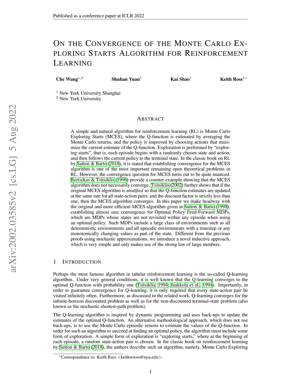 A simple and natural algorithm for reinforcement learning (RL) is Monte Carlo Exploring Starts (MCES), where the Q-function is estimated by averaging the Monte Carlo returns, and the policy is improved by choosing actions that maximize the current estimate of the Q-function. Exploration is performed by "exploring starts", that is, each episode begins with a randomly chosen state and action, and then follows the current policy to the terminal state. In the classic book on RL by Sutton & Barto (2018), it is stated that establishing convergence for the MCES algorithm is one of the most important remaining open theoretical problems in RL. However, the convergence question for MCES turns out to be quite nuanced. Bertsekas & Tsitsiklis (1996) provide a counter-example showing that the MCES algorithm does not necessarily converge. Tsitsiklis (2002) further shows that if the original MCES algorithm is modified so that the Q-function estimates are updated at the same rate for all state-action pairs, and the discount factor is strictly less than one, then the MCES algorithm converges. In this paper we make headway with the original and more efficient MCES algorithm given in Sutton & Barto (1998), establishing almost sure convergence for Optimal Policy Feed-Forward MDPs, which are MDPs whose states are not revisited within any episode when using an optimal policy. Such MDPs include a large class of environments such as all deterministic environments and all episodic environments with a timestep or any monotonically changing values as part of the state. Different from the previous proofs using stochastic approximations, we introduce a novel inductive approach, which is very simple and only makes use of the strong law of large numbers.