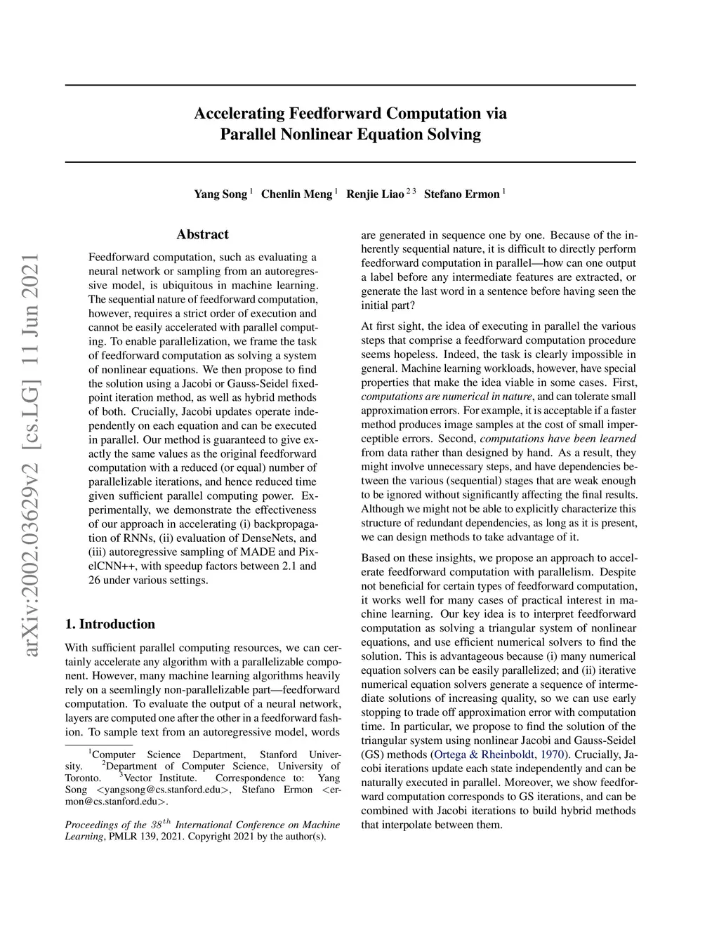 Feedforward computation, such as evaluating a neural network or sampling from an autoregressive model, is ubiquitous in machine learning. The sequential nature of feedforward computation, however, requires a strict order of execution and cannot be easily accelerated with parallel computing. To enable parallelization, we frame the task of feedforward computation as solving a system of nonlinear equations. We then propose to find the solution using a Jacobi or Gauss-Seidel fixed-point iteration method, as well as hybrid methods of both. Crucially, Jacobi updates operate independently on each equation and can be executed in parallel. Our method is guaranteed to give exactly the same values as the original feedforward computation with a reduced (or equal) number of parallelizable iterations, and hence reduced time given sufficient parallel computing power. Experimentally, we demonstrate the effectiveness of our approach in accelerating (i) backpropagation of RNNs, (ii) evaluation of DenseNets, and (iii) autoregressive sampling of MADE and PixelCNN++, with speedup factors between 2.1 and 26 under various settings.