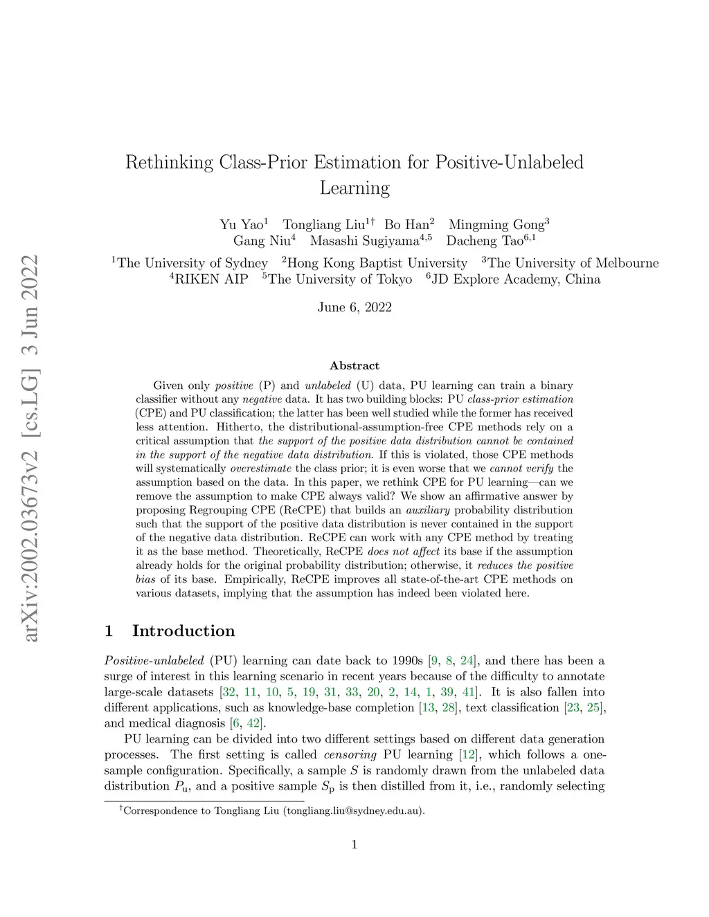 Given only positive (P) and unlabeled (U) data, PU learning can train a binary classifier without any negative data. It has two building blocks: PU class-prior estimation (CPE) and PU classification; the latter has been well studied while the former has received less attention. Hitherto, the distributional-assumption-free CPE methods rely on a critical assumption that the support of the positive data distribution cannot be contained in the support of the negative data distribution. If this is violated, those CPE methods will systematically overestimate the class prior; it is even worse that we cannot verify the assumption based on the data. In this paper, we rethink CPE for PU learning-can we remove the assumption to make CPE always valid? We show an affirmative answer by proposing Regrouping CPE (ReCPE) that builds an auxiliary probability distribution such that the support of the positive data distribution is never contained in the support of the negative data distribution. ReCPE can work with any CPE method by treating it as the base method. Theoretically, ReCPE does not affect its base if the assumption already holds for the original probability distribution; otherwise, it reduces the positive bias of its base. Empirically, ReCPE improves all state-of-the-art CPE methods on various datasets, implying that the assumption has indeed been violated here.