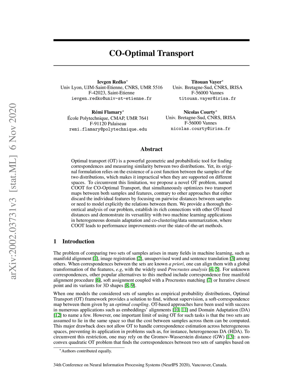 Optimal transport (OT) is a powerful geometric and probabilistic tool for finding correspondences and measuring similarity between two distributions. Yet, its original formulation relies on the existence of a cost function between the samples of the two distributions, which makes it impractical when they are supported on different spaces. To circumvent this limitation, we propose a novel OT problem, named COOT for CO-Optimal Transport, that simultaneously optimizes two transport maps between both samples and features, contrary to other approaches that either discard the individual features by focusing on pairwise distances between samples or need to model explicitly the relations between them. We provide a thorough theoretical analysis of our problem, establish its rich connections with other OT-based distances and demonstrate its versatility with two machine learning applications in heterogeneous domain adaptation and co-clustering/data summarization, where COOT leads to performance improvements over the state-of-the-art methods.