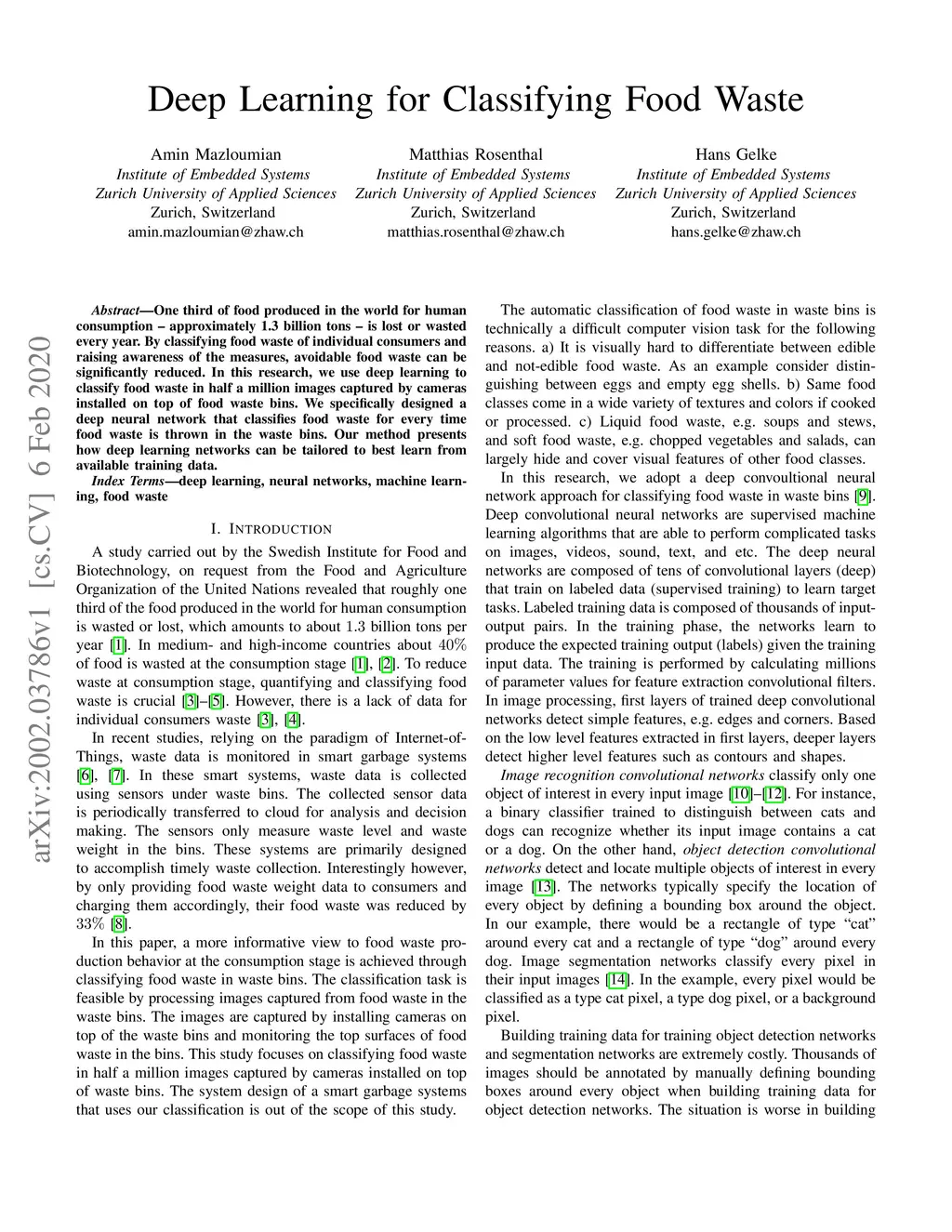 One third of food produced in the world for human consumption -- approximately 1.3 billion tons -- is lost or wasted every year. By classifying food waste of individual consumers and raising awareness of the measures, avoidable food waste can be significantly reduced. In this research, we use deep learning to classify food waste in half a million images captured by cameras installed on top of food waste bins. We specifically designed a deep neural network that classifies food waste for every time food waste is thrown in the waste bins. Our method presents how deep learning networks can be tailored to best learn from available training data.