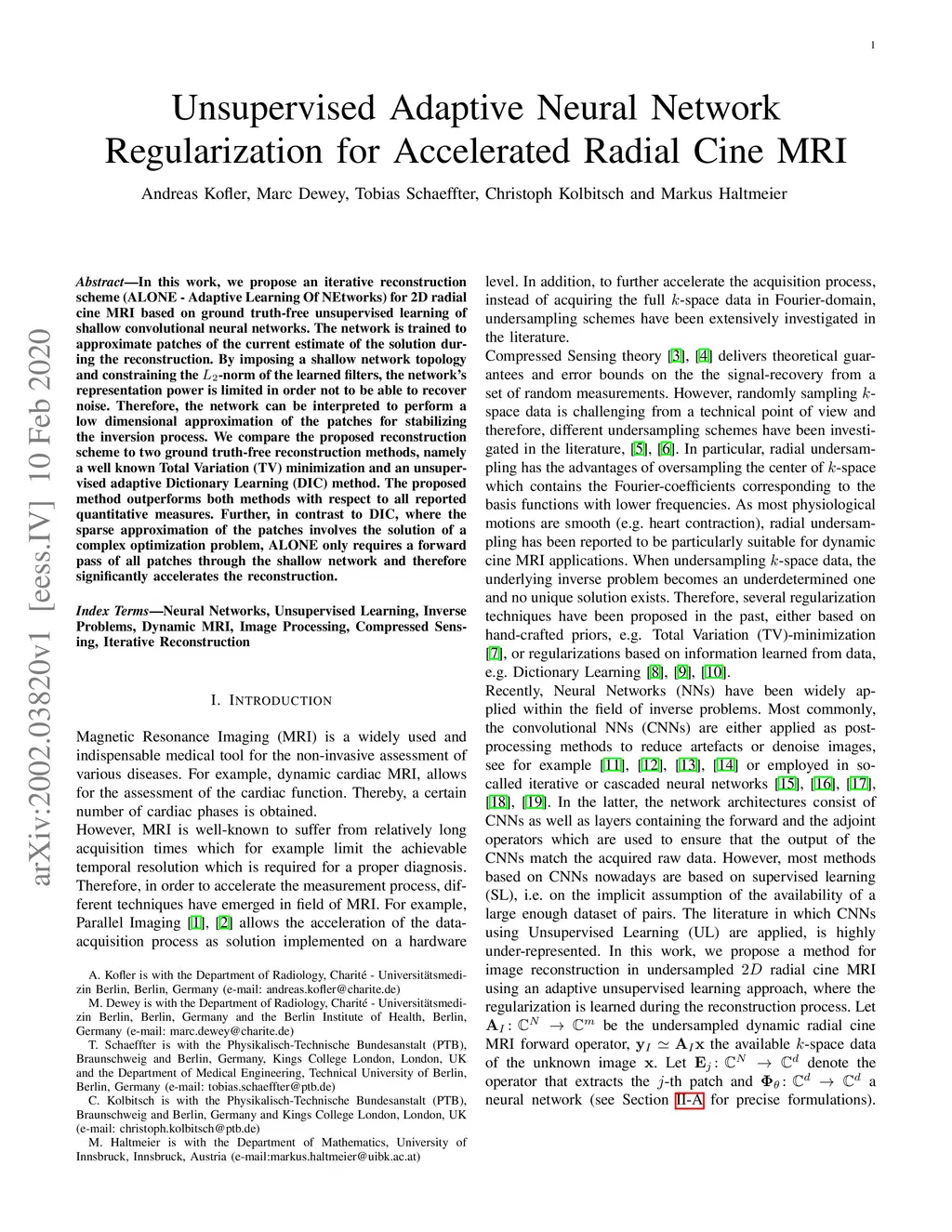 In this work, we propose an iterative reconstruction scheme (ALONE - Adaptive Learning Of NEtworks) for 2D radial cine MRI based on ground truth-free unsupervised learning of shallow convolutional neural networks. The network is trained to approximate patches of the current estimate of the solution during the reconstruction. By imposing a shallow network topology and constraining the -norm of the learned filters, the network's representation power is limited in order not to be able to recover noise. Therefore, the network can be interpreted to perform a low dimensional approximation of the patches for stabilizing the inversion process. We compare the proposed reconstruction scheme to two ground truth-free reconstruction methods, namely a well known Total Variation (TV) minimization and an unsupervised adaptive Dictionary Learning (DIC) method. The proposed method outperforms both methods with respect to all reported quantitative measures. Further, in contrast to DIC, where the sparse approximation of the patches involves the solution of a complex optimization problem, ALONE only requires a forward pass of all patches through the shallow network and therefore significantly accelerates the reconstruction.