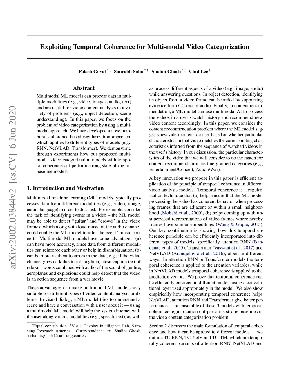 Exploiting Temporal Coherence for Multi-modal Video Categorization