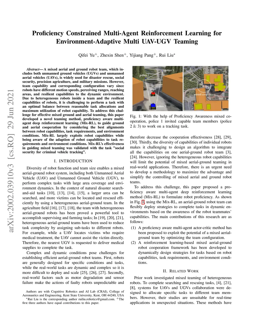 A mixed aerial and ground robot team, which includes both unmanned ground vehicles (UGVs) and unmanned aerial vehicles (UAVs), is widely used for disaster rescue, social security, precision agriculture, and military missions. However, team capability and corresponding configuration vary since robots have different motion speeds, perceiving ranges, reaching areas, and resilient capabilities to the dynamic environment. Due to heterogeneous robots inside a team and the resilient capabilities of robots, it is challenging to perform a task with an optimal balance between reasonable task allocations and maximum utilization of robot capability. To address this challenge for effective mixed ground and aerial teaming, this paper developed a novel teaming method, proficiency aware multi-agent deep reinforcement learning (Mix-RL), to guide ground and aerial cooperation by considering the best alignments between robot capabilities, task requirements, and environment conditions. Mix-RL largely exploits robot capabilities while being aware of the adaption of robot capabilities to task requirements and environment conditions. Mix-RL's effectiveness in guiding mixed teaming was validated with the task "social security for criminal vehicle tracking".
