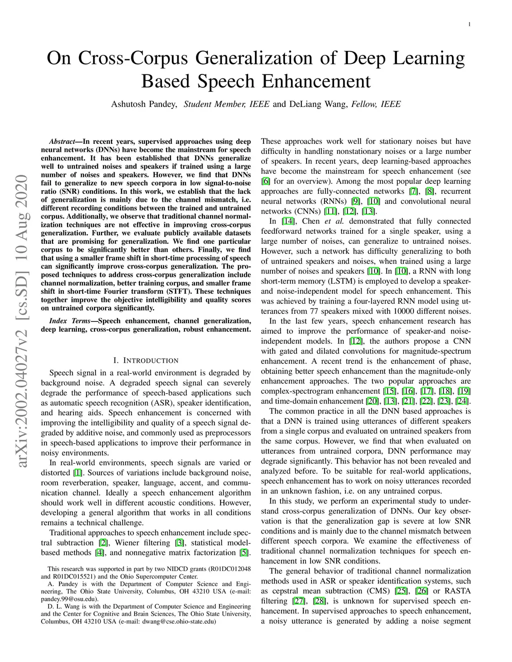 In recent years, supervised approaches using deep neural networks (DNNs) have become the mainstream for speech enhancement. It has been established that DNNs generalize well to untrained noises and speakers if trained using a large number of noises and speakers. However, we find that DNNs fail to generalize to new speech corpora in low signal-to-noise ratio (SNR) conditions. In this work, we establish that the lack of generalization is mainly due to the channel mismatch, i.e. different recording conditions between the trained and untrained corpus. Additionally, we observe that traditional channel normalization techniques are not effective in improving cross-corpus generalization. Further, we evaluate publicly available datasets that are promising for generalization. We find one particular corpus to be significantly better than others. Finally, we find that using a smaller frame shift in short-time processing of speech can significantly improve cross-corpus generalization. The proposed techniques to address cross-corpus generalization include channel normalization, better training corpus, and smaller frame shift in short-time Fourier transform (STFT). These techniques together improve the objective intelligibility and quality scores on untrained corpora significantly.