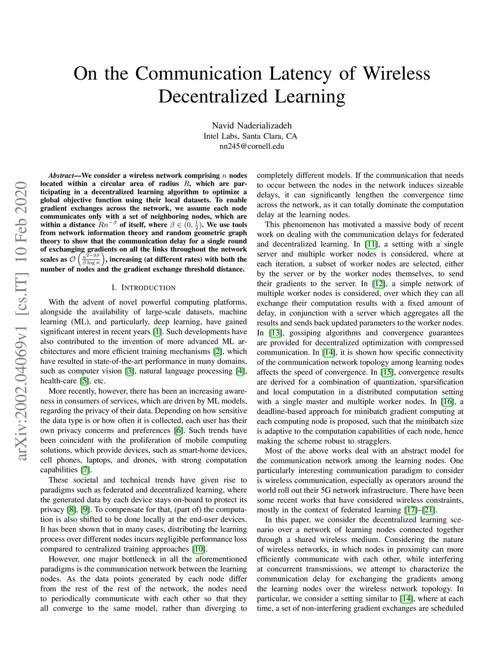 We consider a wireless network comprising nodes located within a circular area of radius , which are participating in a decentralized learning algorithm to optimize a global objective function using their local datasets. To enable gradient exchanges across the network, we assume each node communicates only with a set of neighboring nodes, which are within a distance of itself, where . We use tools from network information theory and random geometric graph theory to show that the communication delay for a single round of exchanging gradients on all the links throughout the network scales as , increasing (at different rates) with both the number of nodes and the gradient exchange threshold distance.