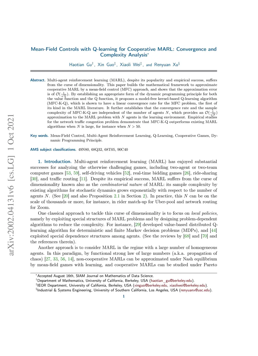 Mean-Field Controls with Q-learning for Cooperative MARL: Convergence