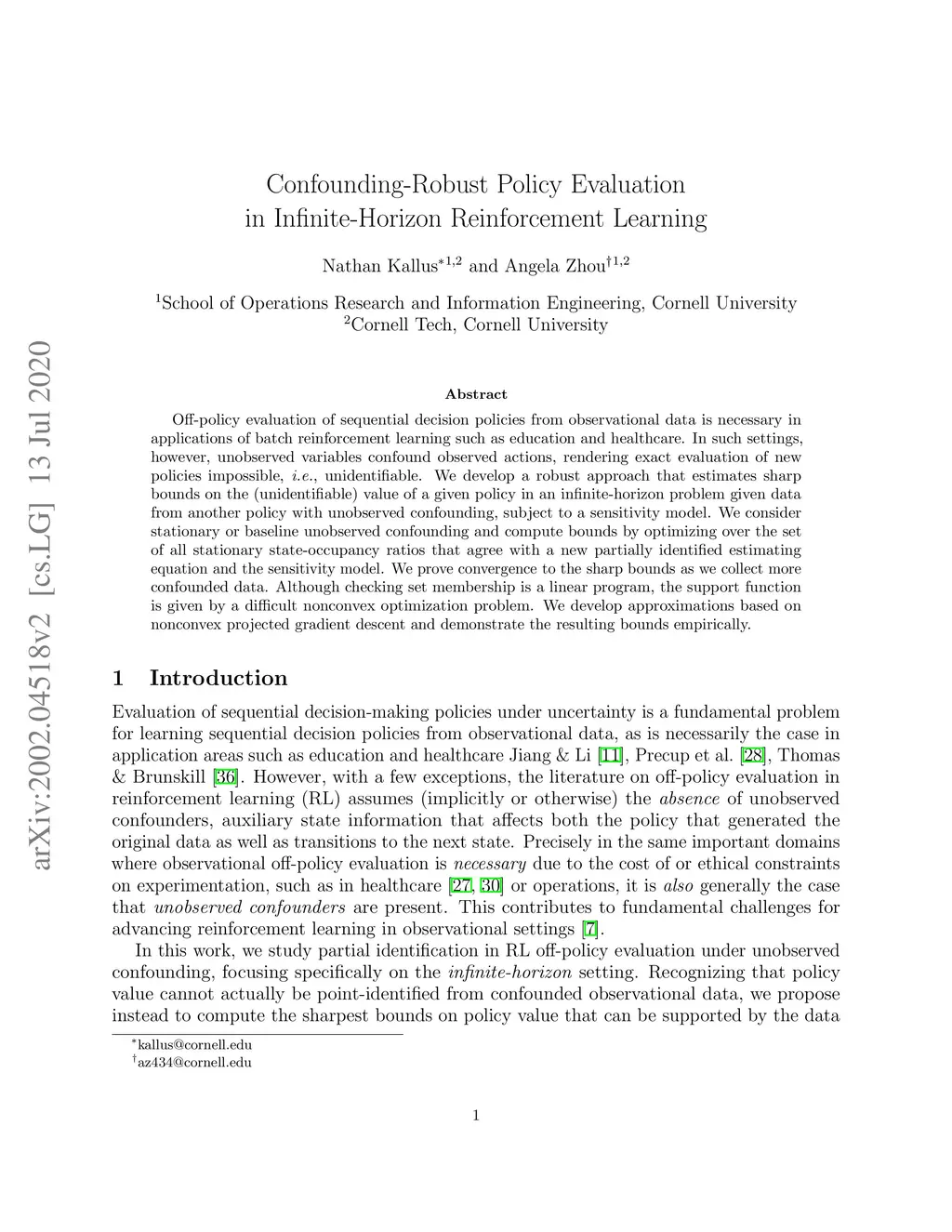 Off-policy evaluation of sequential decision policies from observational data is necessary in applications of batch reinforcement learning such as education and healthcare. In such settings, however, unobserved variables confound observed actions, rendering exact evaluation of new policies impossible, i.e., unidentifiable. We develop a robust approach that estimates sharp bounds on the (unidentifiable) value of a given policy in an infinite-horizon problem given data from another policy with unobserved confounding, subject to a sensitivity model. We consider stationary or baseline unobserved confounding and compute bounds by optimizing over the set of all stationary state-occupancy ratios that agree with a new partially identified estimating equation and the sensitivity model. We prove convergence to the sharp bounds as we collect more confounded data. Although checking set membership is a linear program, the support function is given by a difficult nonconvex optimization problem. We develop approximations based on nonconvex projected gradient descent and demonstrate the resulting bounds empirically.