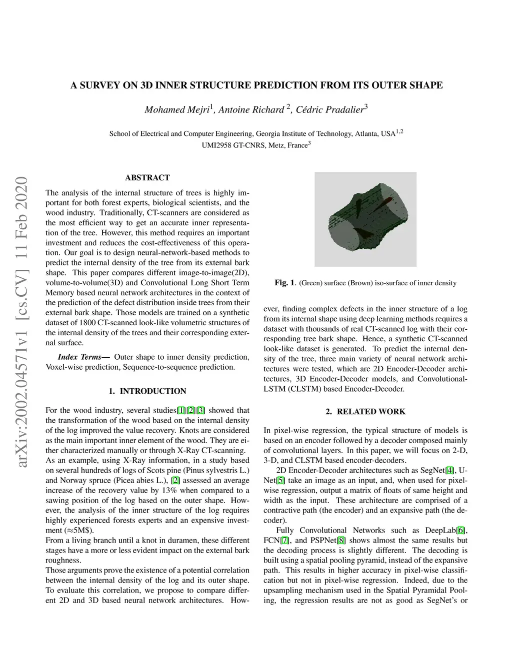 The analysis of the internal structure of trees is highly important for both forest experts, biological scientists, and the wood industry. Traditionally, CT-scanners are considered as the most efficient way to get an accurate inner representation of the tree. However, this method requires an important investment and reduces the cost-effectiveness of this operation. Our goal is to design neural-network-based methods to predict the internal density of the tree from its external bark shape. This paper compares different image-to-image(2D), volume-to-volume(3D) and Convolutional Long Short Term Memory based neural network architectures in the context of the prediction of the defect distribution inside trees from their external bark shape. Those models are trained on a synthetic dataset of 1800 CT-scanned look-like volumetric structures of the internal density of the trees and their corresponding external surface.