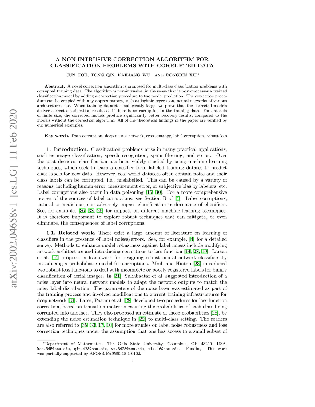 A novel correction algorithm is proposed for multi-class classification problems with corrupted training data. The algorithm is non-intrusive, in the sense that it post-processes a trained classification model by adding a correction procedure to the model prediction. The correction procedure can be coupled with any approximators, such as logistic regression, neural networks of various architectures, etc. When training dataset is sufficiently large, we prove that the corrected models deliver correct classification results as if there is no corruption in the training data. For datasets of finite size, the corrected models produce significantly better recovery results, compared to the models without the correction algorithm. All of the theoretical findings in the paper are verified by our numerical examples.