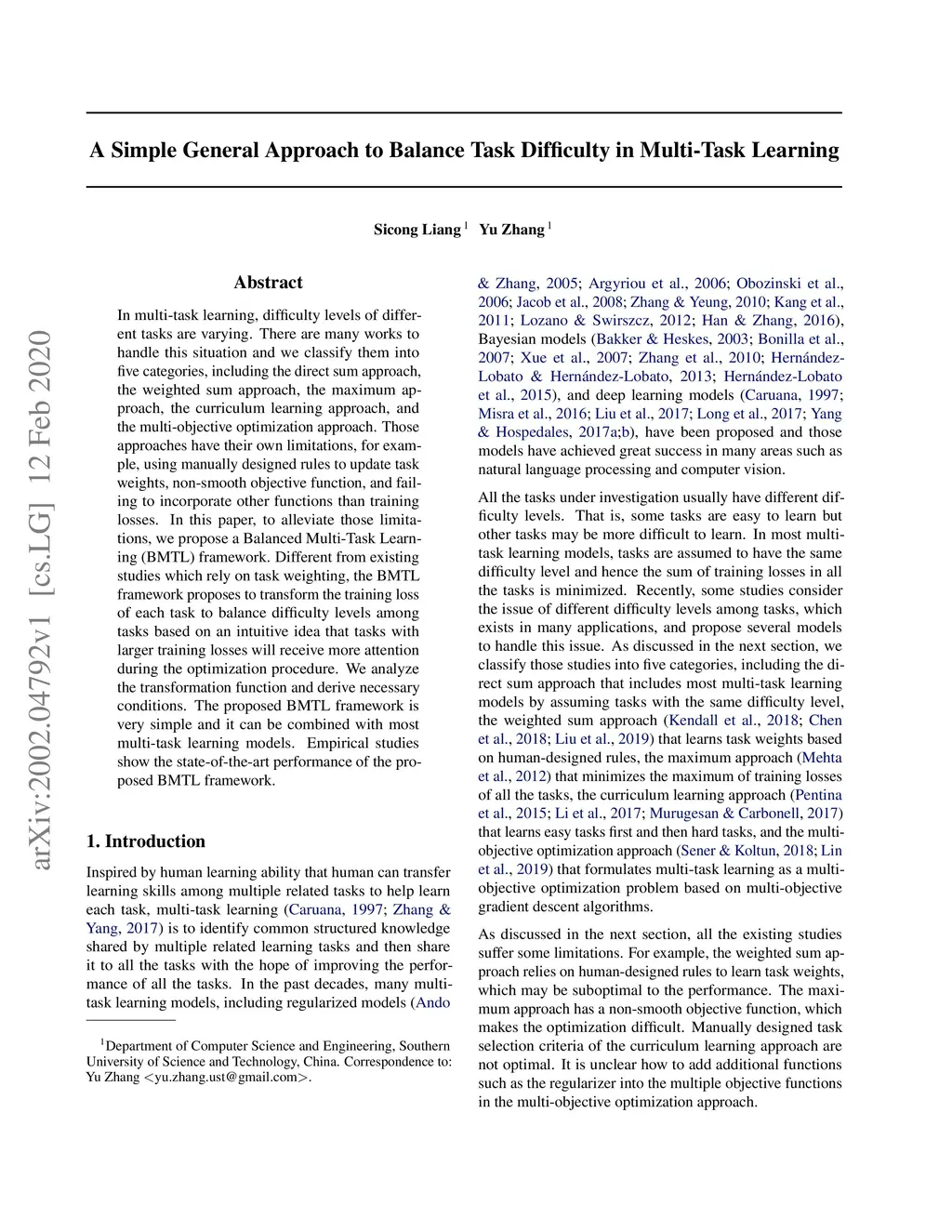 In multi-task learning, difficulty levels of different tasks are varying. There are many works to handle this situation and we classify them into five categories, including the direct sum approach, the weighted sum approach, the maximum approach, the curriculum learning approach, and the multi-objective optimization approach. Those approaches have their own limitations, for example, using manually designed rules to update task weights, non-smooth objective function, and failing to incorporate other functions than training losses. In this paper, to alleviate those limitations, we propose a Balanced Multi-Task Learning (BMTL) framework. Different from existing studies which rely on task weighting, the BMTL framework proposes to transform the training loss of each task to balance difficulty levels among tasks based on an intuitive idea that tasks with larger training losses will receive more attention during the optimization procedure. We analyze the transformation function and derive necessary conditions. The proposed BMTL framework is very simple and it can be combined with most multi-task learning models. Empirical studies show the state-of-the-art performance of the proposed BMTL framework.