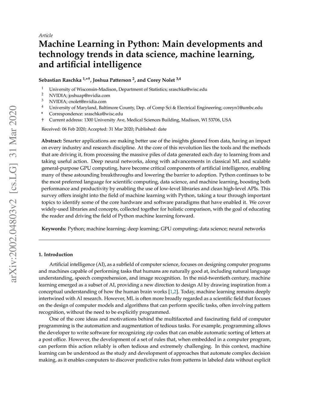 Smarter applications are making better use of the insights gleaned from data, having an impact on every industry and research discipline. At the core of this revolution lies the tools and the methods that are driving it, from processing the massive piles of data generated each day to learning from and taking useful action. Deep neural networks, along with advancements in classical ML and scalable general-purpose GPU computing, have become critical components of artificial intelligence, enabling many of these astounding breakthroughs and lowering the barrier to adoption. Python continues to be the most preferred language for scientific computing, data science, and machine learning, boosting both performance and productivity by enabling the use of low-level libraries and clean high-level APIs. This survey offers insight into the field of machine learning with Python, taking a tour through important topics to identify some of the core hardware and software paradigms that have enabled it. We cover widely-used libraries and concepts, collected together for holistic comparison, with the goal of educating the reader and driving the field of Python machine learning forward.