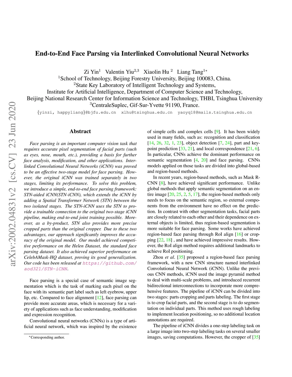 Face parsing is an important computer vision task that requires accurate pixel segmentation of facial parts (such as eyes, nose, mouth, etc.), providing a basis for further face analysis, modification, and other applications. Interlinked Convolutional Neural Networks (iCNN) was proved to be an effective two-stage model for face parsing. However, the original iCNN was trained separately in two stages, limiting its performance. To solve this problem, we introduce a simple, end-to-end face parsing framework: STN-aided iCNN(STN-iCNN), which extends the iCNN by adding a Spatial Transformer Network (STN) between the two isolated stages. The STN-iCNN uses the STN to provide a trainable connection to the original two-stage iCNN pipeline, making end-to-end joint training possible. Moreover, as a by-product, STN also provides more precise cropped parts than the original cropper. Due to these two advantages, our approach significantly improves the accuracy of the original model. Our model achieved competitive performance on the Helen Dataset, the standard face parsing dataset. It also achieved superior performance on CelebAMask-HQ dataset, proving its good generalization. Our code has been released at https://github.com/aod321/STN-iCNN.