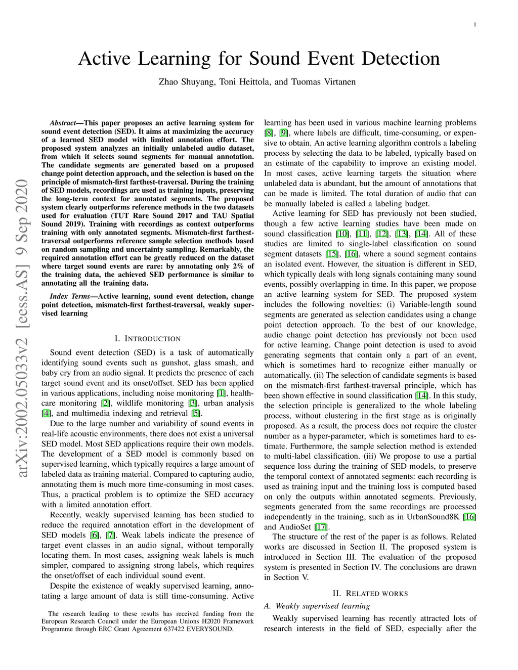 This paper proposes an active learning system for sound event detection (SED). It aims at maximizing the accuracy of a learned SED model with limited annotation effort. The proposed system analyzes an initially unlabeled audio dataset, from which it selects sound segments for manual annotation. The candidate segments are generated based on a proposed change point detection approach, and the selection is based on the principle of mismatch-first farthest-traversal. During the training of SED models, recordings are used as training inputs, preserving the long-term context for annotated segments. The proposed system clearly outperforms reference methods in the two datasets used for evaluation (TUT Rare Sound 2017 and TAU Spatial Sound 2019). Training with recordings as context outperforms training with only annotated segments. Mismatch-first farthest-traversal outperforms reference sample selection methods based on random sampling and uncertainty sampling. Remarkably, the required annotation effort can be greatly reduced on the dataset where target sound events are rare: by annotating only 2% of the training data, the achieved SED performance is similar to annotating all the training data.