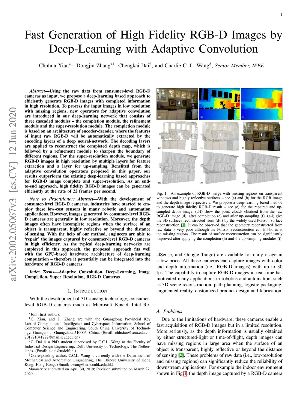 Using the raw data from consumer-level RGB-D cameras as input, we propose a deep-learning based approach to efficiently generate RGB-D images with completed information in high resolution. To process the input images in low resolution with missing regions, new operators for adaptive convolution are introduced in our deep-learning network that consists of three cascaded modules -- the completion module, the refinement module and the super-resolution module. The completion module is based on an architecture of encoder-decoder, where the features of input raw RGB-D will be automatically extracted by the encoding layers of a deep neural-network. The decoding layers are applied to reconstruct the completed depth map, which is followed by a refinement module to sharpen the boundary of different regions. For the super-resolution module, we generate RGB-D images in high resolution by multiple layers for feature extraction and a layer for up-sampling. Benefited from the adaptive convolution operators newly proposed in this paper, our results outperform the existing deep-learning based approaches for RGB-D image complete and super-resolution. As an end-to-end approach, high fidelity RGB-D images can be generated efficiently at the rate of around 21 frames per second.
